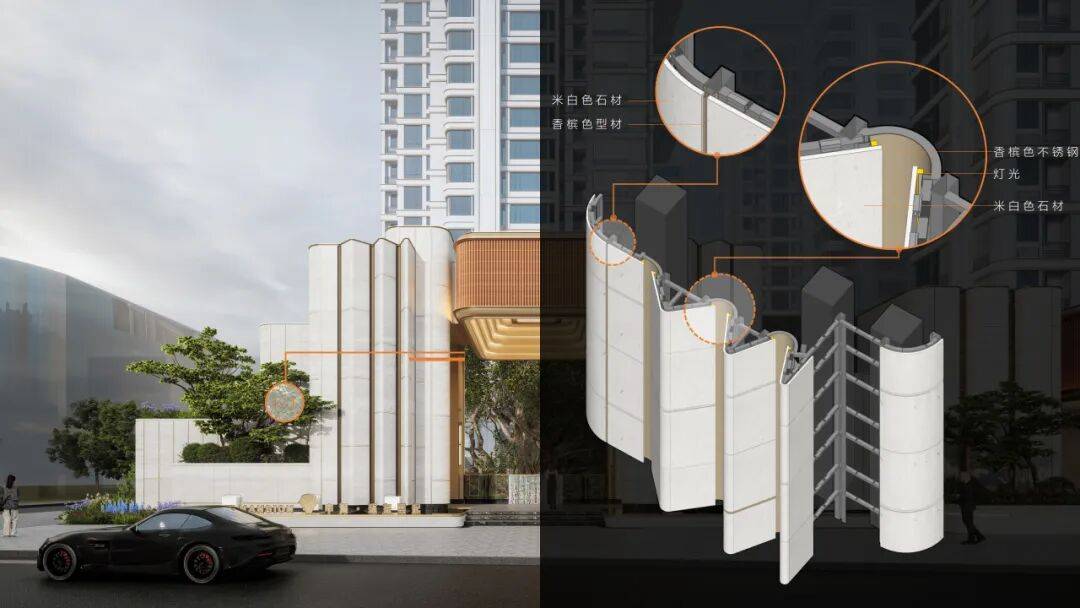 ▲框景入口实景图©IN-FIELD studio 在构建空间秩序的同时,材料是我们与这片土地对话的另一种语言 本项目精心选用了体现在地性的石材,辅以不锈钢及铝板做细节线条设计。在主材构造、尺寸把控、去胶化、密拼工艺、弧形造型的落地,严抠交接,坚持材料的完整性等维度都给与高度关注。