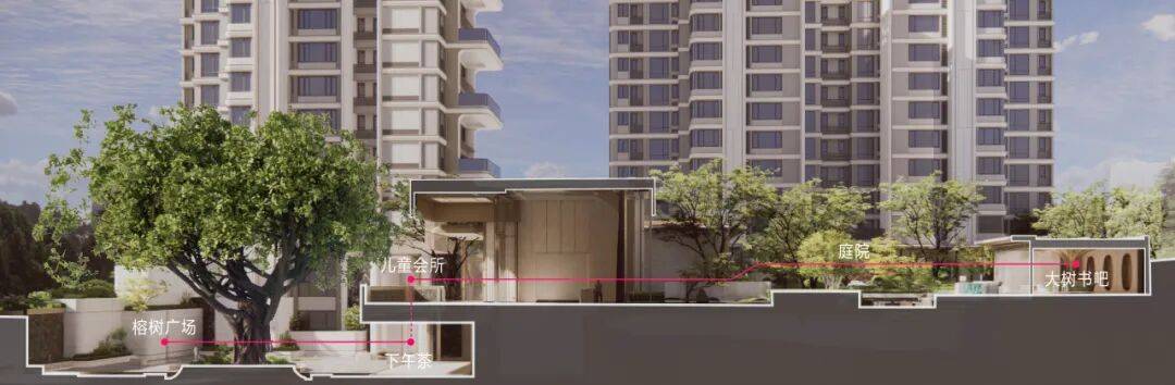 ▲榕树广场剖透分析 ©ZEN ▲地面归家实景图©IN-FIELD studio 02. 借景入院 构筑空间的层次感 设计以榕荫、红砖与礁石肌理的标志性符号为起点,延展出两进开放院落界面。 示范区以“回型动线”展开叙事:外圈是连贯的展示与归家路径,内圈则围合出层层退台的庭院。塔楼底部的架空空间也被纳入这一系统,让人可以在不同高度间穿行、驻足、回望。行走其中,建筑、庭院与景观渐渐融为一个可漫步、可回游的生活场景。 ▲地块鸟瞰路径分析 ©ZEN “榕上雅集”会所以匠心设计打造,集榕树广场、儿童会所、健身中心、艺术廊柱、大树书吧于一体,通过室内外空间的有序过渡,塑造出流动性强、体验丰富的游园式空间氛围。