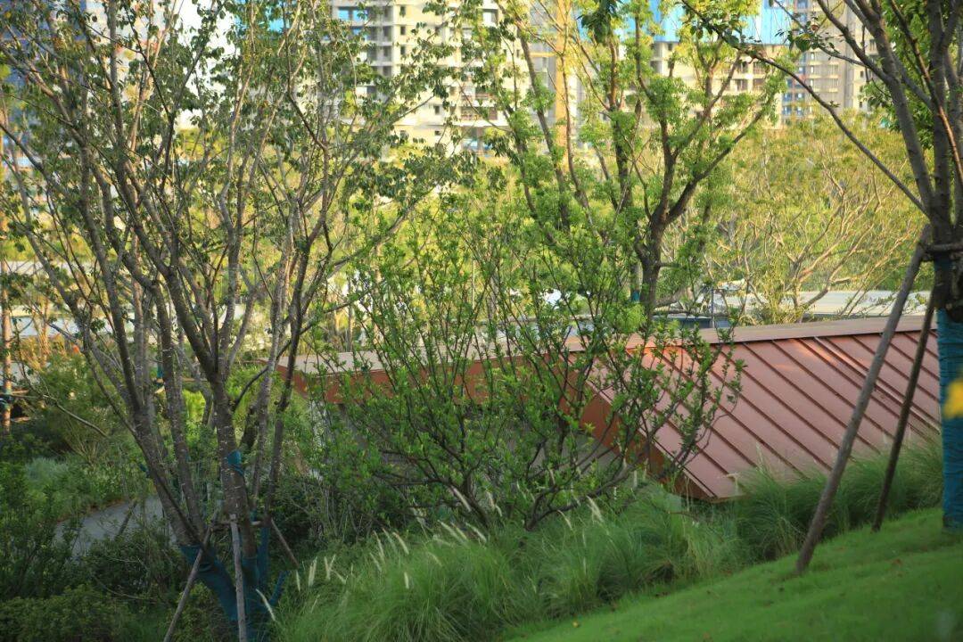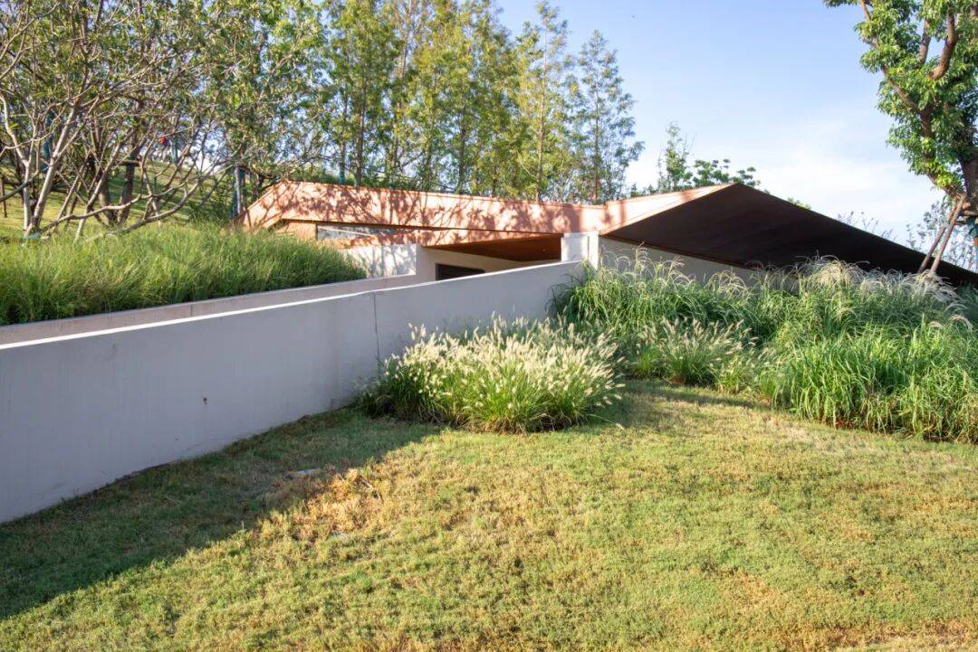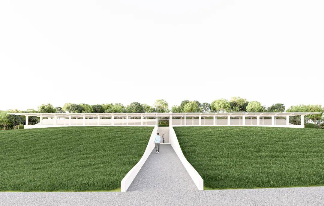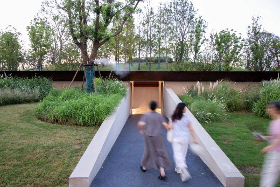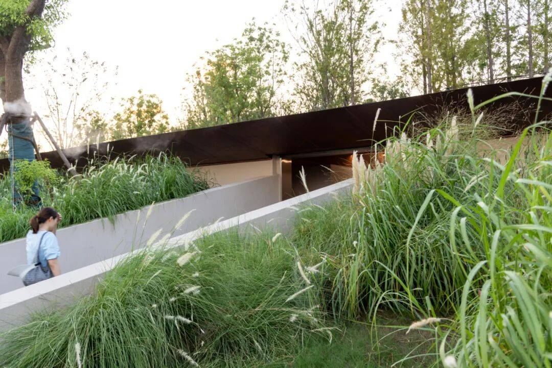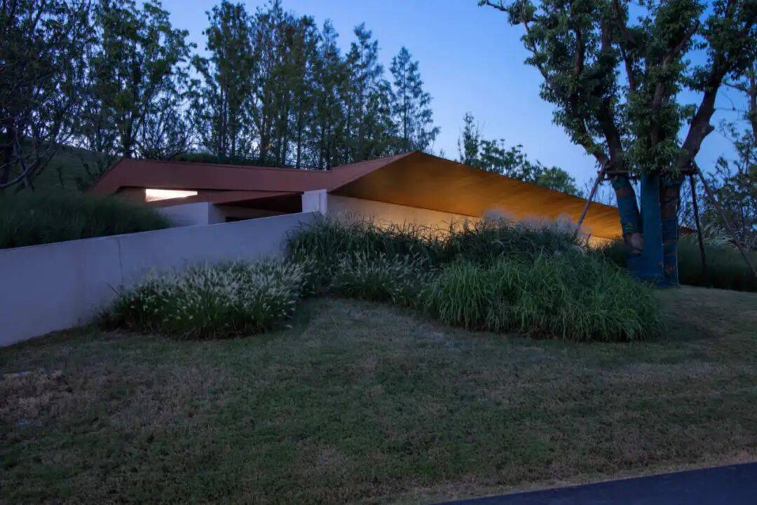 ©存在建筑 草场浮廊-极致的屋顶 项目伊始,我们便提出了草场浮廊的概念,不仅是对于之前卫生间设计经验的直觉性反应,也是对于麓客岛规划环境的回应,我们认为这个建筑应该是优雅立于草场上的一条的长廊,轻盈剔透。后期由于规划的改变,建筑场地被转移,卫生间变成了半覆土的状态,长廊也被抽象成了屋顶,并为了追求极致,将立面的屋顶展示面提炼成了一根直线。