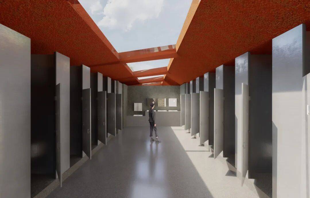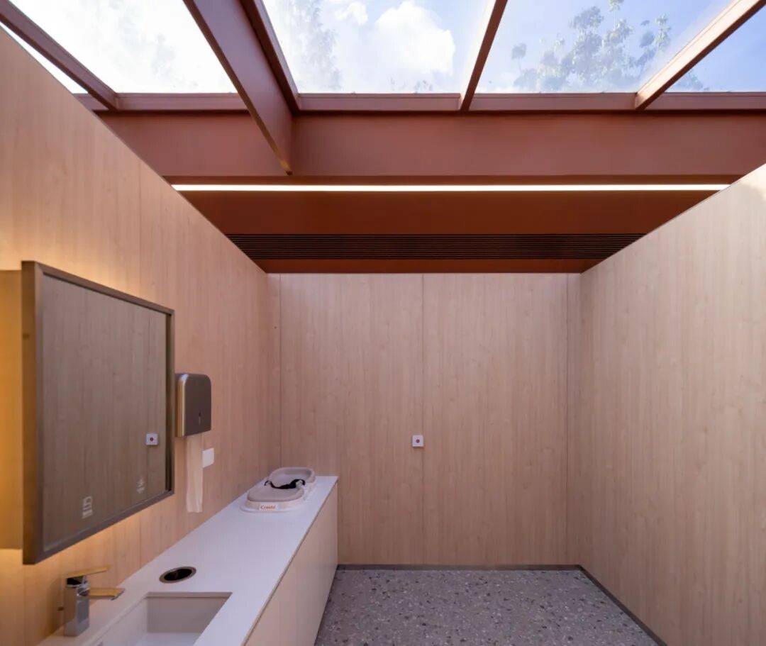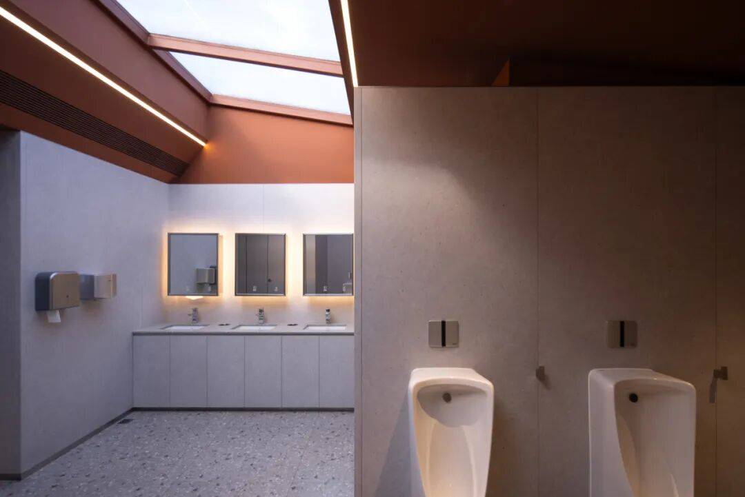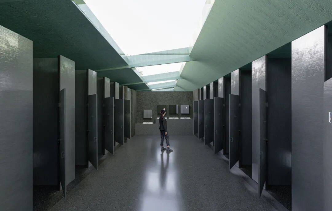 ©存在建筑 从卫生间到驿站 近些年,工作室在各种竞赛与委托中设计了一系列的小型卫生间,他们都融合了或多或少的公共属性的功能(环卫工人休息室、附属用房、自动售卖空间等),卫生间这一空间母体也在不同的场合发生着变化,而在我们这次的设计中,前期甲方就提出了为麓客岛开产活动仓库的需求,并在后期由于其地理位置的优越性,将临时办公空间放置在了这里。公共卫生间日趋变成了小型综合公共基础设施,设计的维度在不断进行着拓展。
