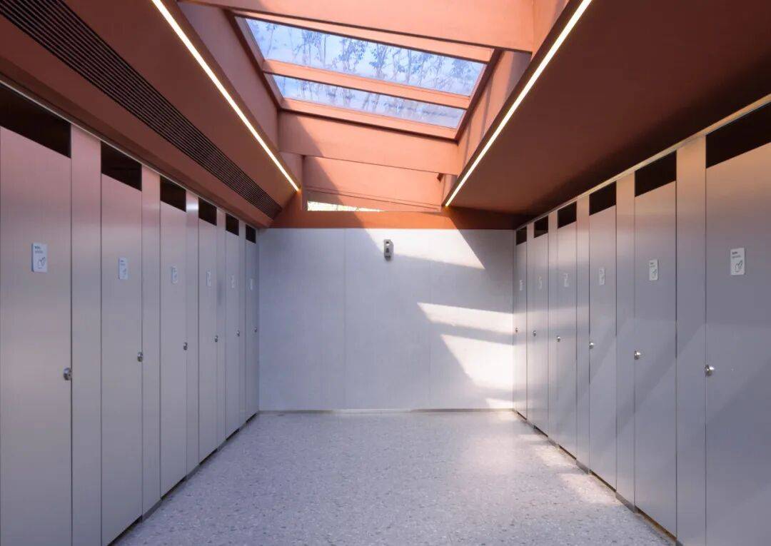 母婴室 ©变余构造 线性光 我们在建筑的长向设置了贯通整个建筑屋顶的天光,让阳光充分地洒在整个空间内,室内主要灯光的布置也沿着天窗的方向,与通长的风口一起强化了线性的形态,是为地穴上的无限天空。主要的室外灯光也是从地面向上打亮屋顶的出挑,在夜间形成一根长向的线性光带。