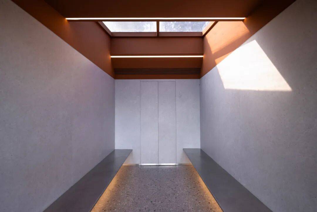 建成屋顶半覆土场地 ©存在建筑 洞穴般的室内 考虑到半覆土的建筑姿态与武汉的炎炎夏日,地穴自然而然成为了我们对于建筑室内的想象。烈日中走入地穴的舒爽凉风是对抗江城火炉炎热的最好武器。但后期处于成本以及维护的考虑,以粗粝且深沉的的仿石涂料为主材的室内被替换成为了颜色相对较浅的饰面碳晶板,“深”地穴的意向被瓦解。天光中,饰面板,水磨石板、仿金属抗培特板的主材形成了别样的“浅地穴”。