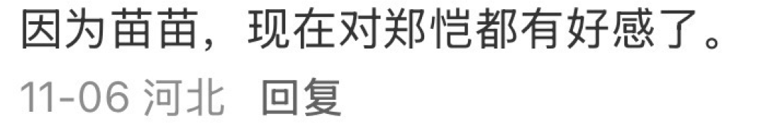 谁也没想到,之前上夫妻综艺(《妻子的浪漫旅行》《天声一对》),正大光明秀恩爱的俩人,竟然在一个生存节目里扭转风评了? 与此同时,苗苗的口碑似乎也逆转了?👇 之前参加《妻子的浪漫旅行》被骂惨了, 说她不合群👇 说她情商低👇 说她汉子茶👇 不过后知后觉说一句,或许苗苗本身没什么问题,只是当时她被框在「郑恺妻子」这个身份里, 如今到了野外生存节目, 她拿回主体性,再加上本身和生存节目的适配度很高,「自我」得到舒展空间,于是高能量的一面被看到, 说她「执行力超强」👇 怀疑PD都下班了,她还能返个工(很合理了)👇 事实证明没有她克服不了的问题,想吃烤茄子,
