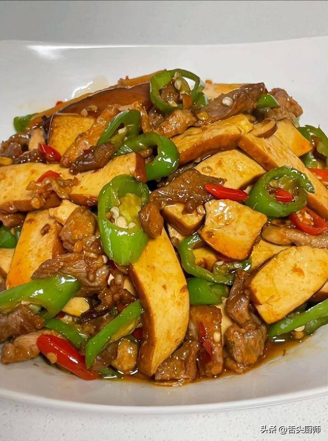 5. 倒入煎好的香干和肉片,加1勺生抽翻炒均匀。