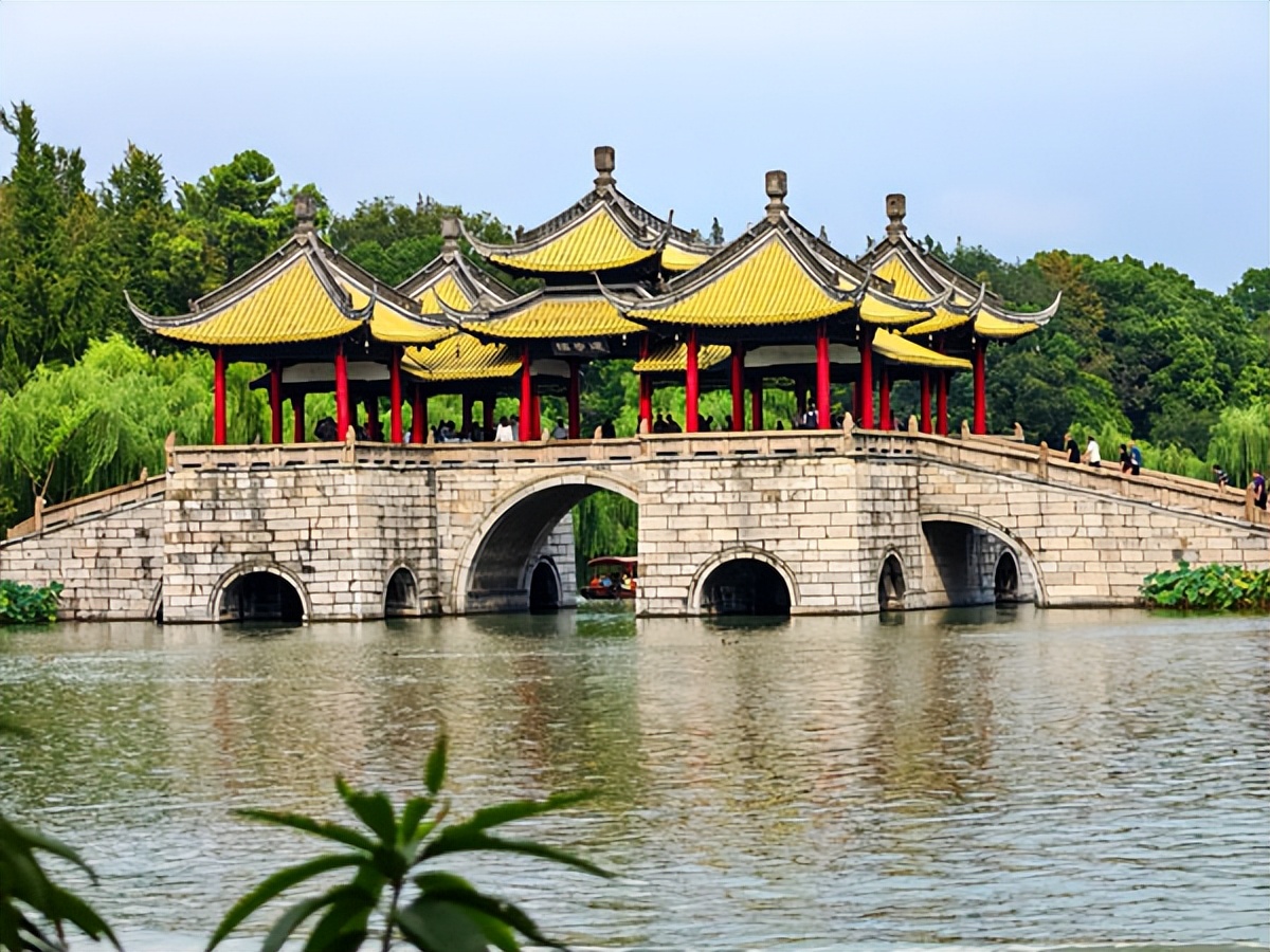 五亭桥(摄影:周长满) 我们首先来到了“五亭桥”。只见这座桥造型独特,亭顶覆盖着黄色琉璃瓦,在阳光下熠熠生辉。桥下有十五个桥洞,据说每逢满月之夜,十五个桥洞内各映一轮明月,“十五的月亮十六圆”的奇观便由此而来。站在桥边,微风拂过,湖面泛起涟漪,桥与亭、水与天相映成趣,让人忍不住感叹建筑与自然的完美融合。