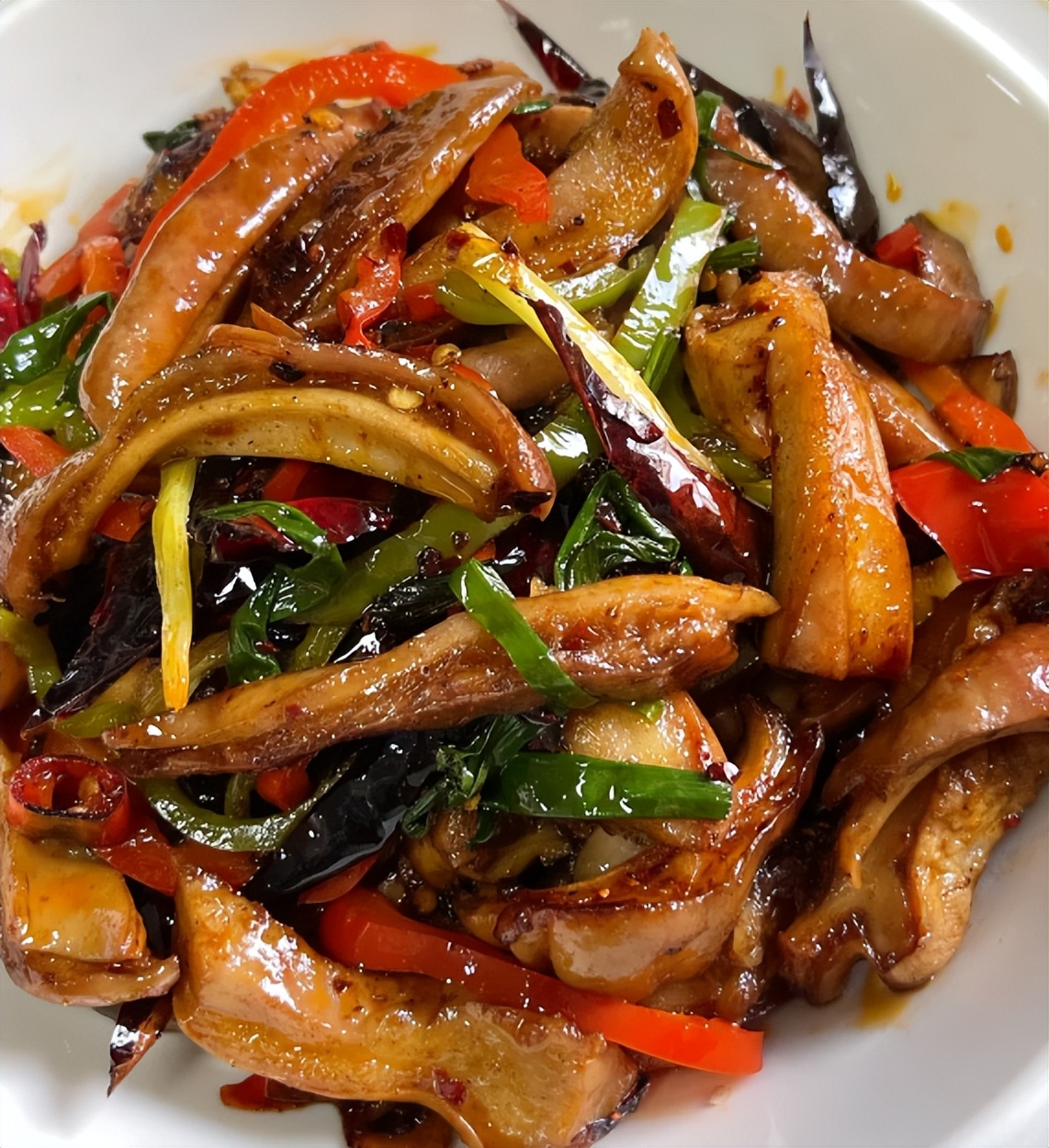 接着,沿着滚烫的锅边烹入少许料酒或生抽,香气瞬间激发。再下青红椒等配料,继续大火翻炒10-15秒。最后加入盐、蚝油等调味,快速翻炒均匀,立即出锅。