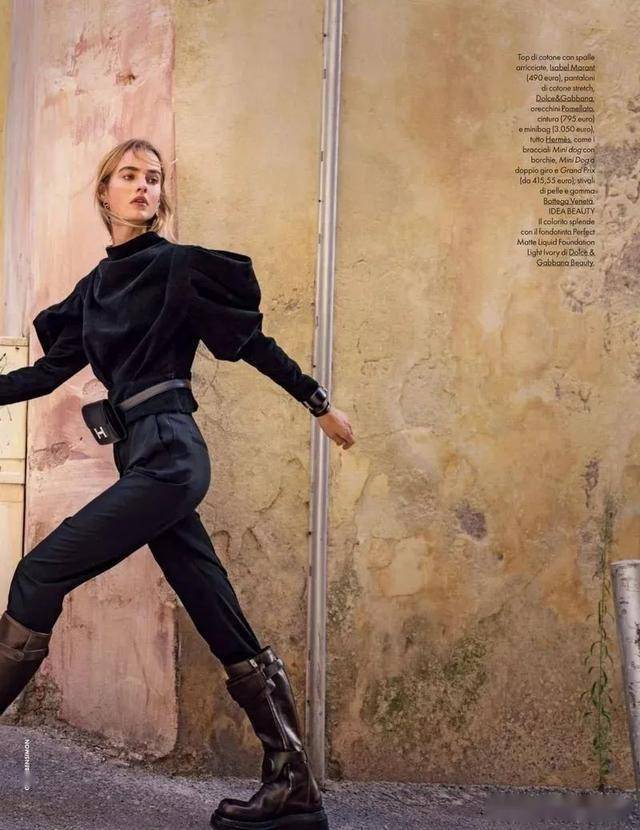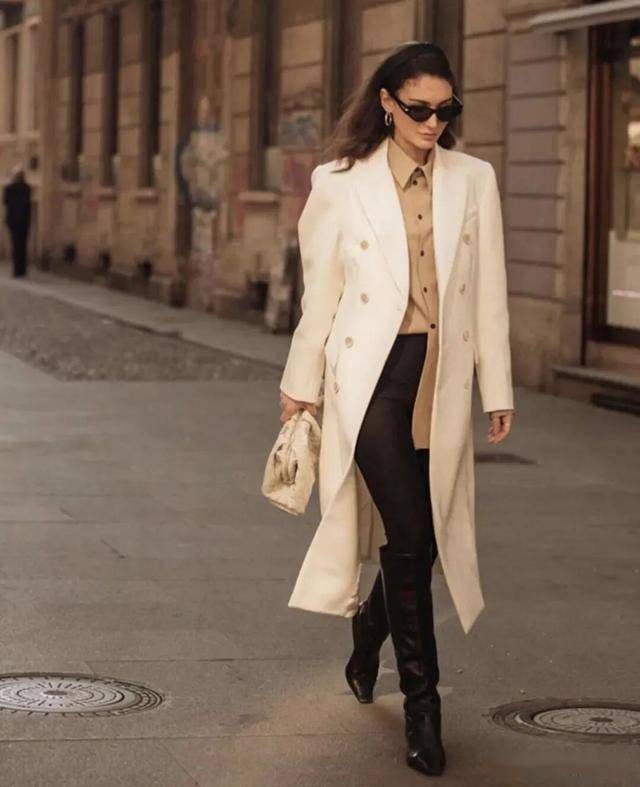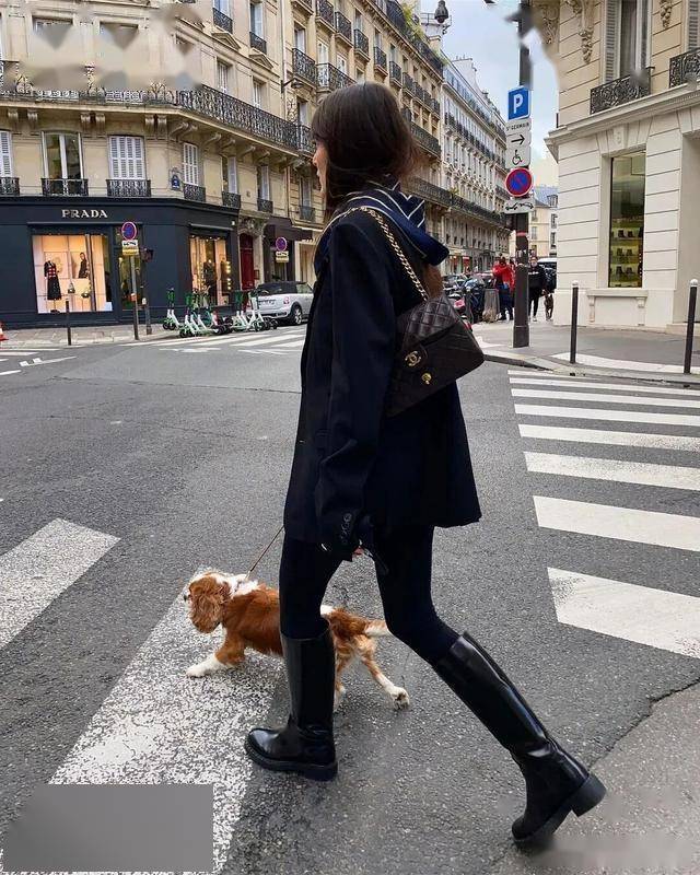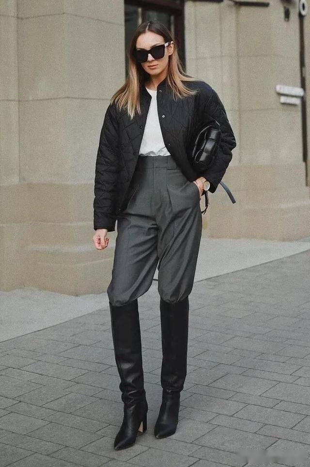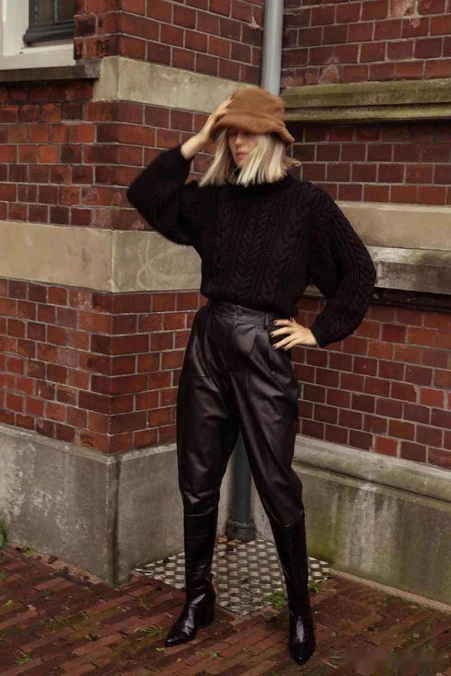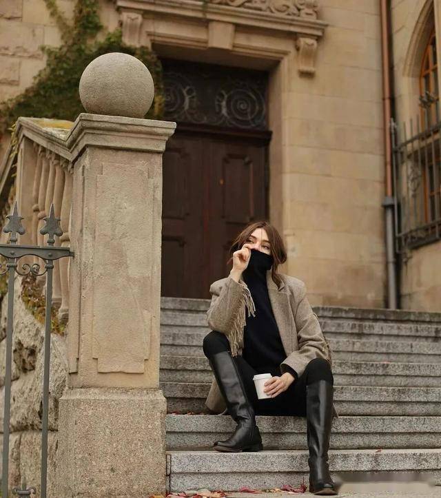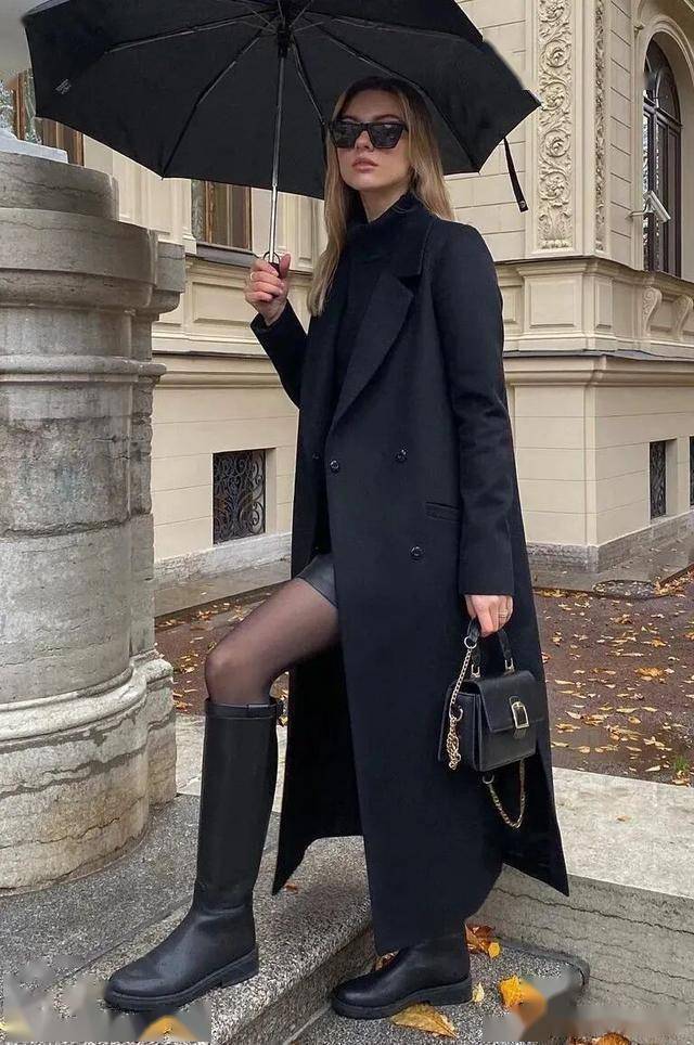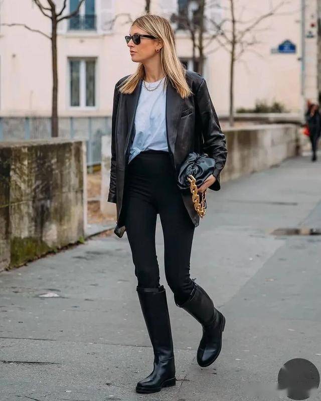 黑色紧身裤+黑色骑士靴是标配,毫无拖沓感,显腿长的效果非常好,一看就是很会穿的时髦精。