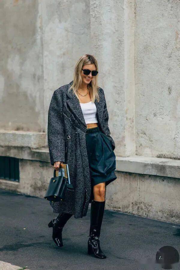 皮质短裙搭配骑士靴,很适合南方的集美,恰到好处的露肤度显得更清爽~怕冷就再披上一件利落的大衣,上长下短营造层次感,谁看了能不夸一句真chic?