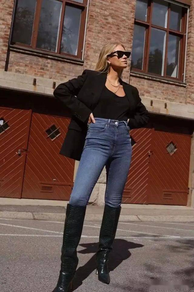 当骑士靴遇见牛仔裤,一米五巧变一米七,当然牛仔裤要选择紧身的,更能突出大长腿,搭配一件长款或短款外套都特别飒。