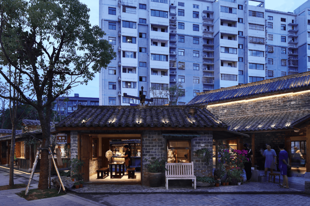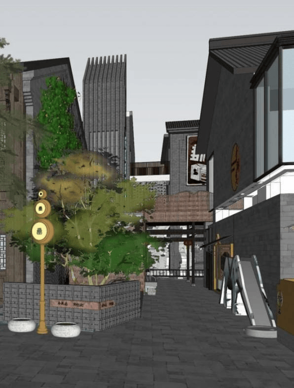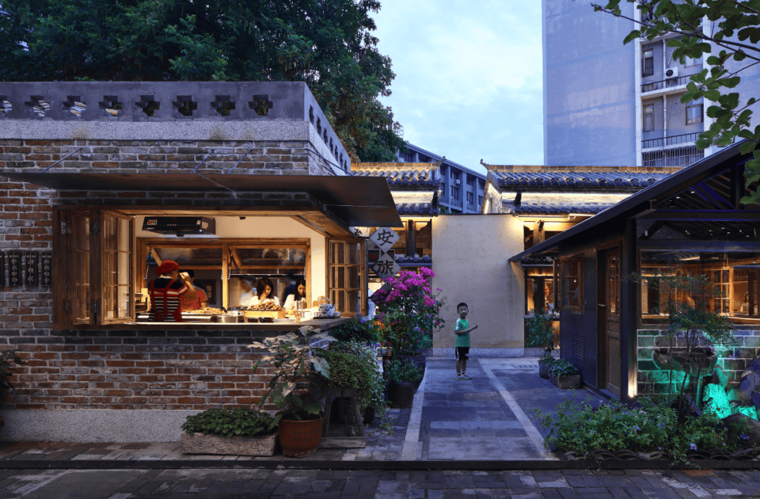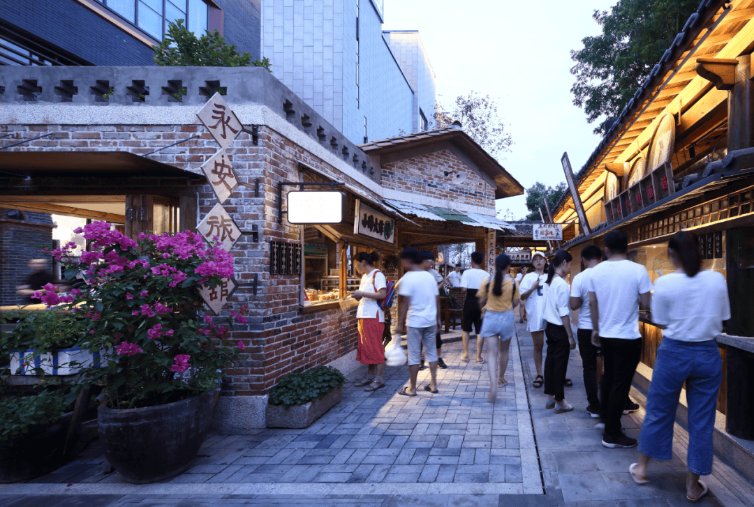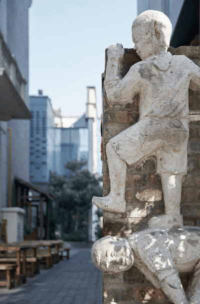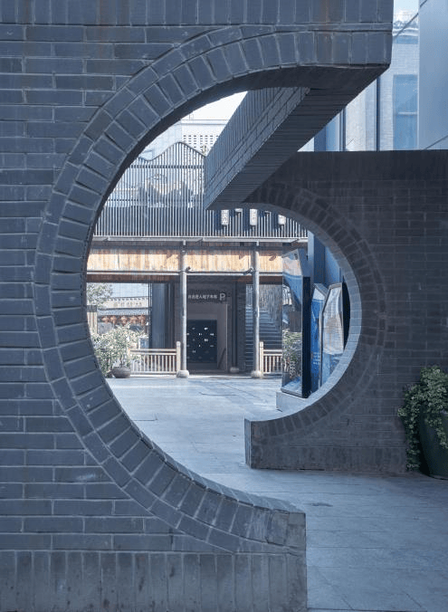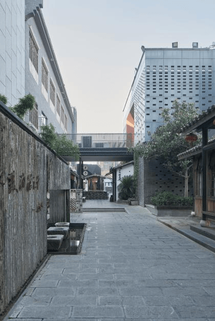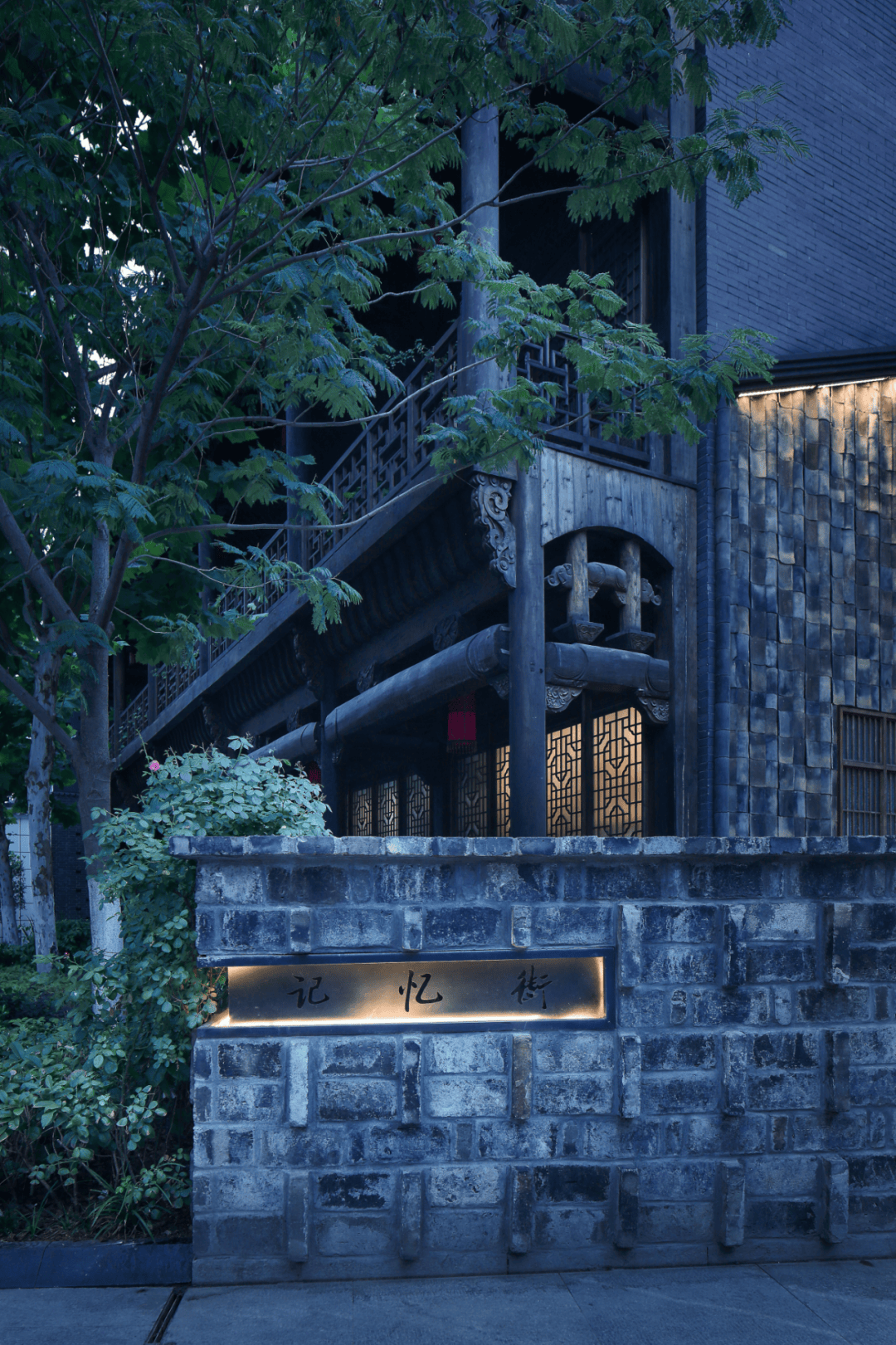主街景观小品 最美的瞬间便是夜晚霓虹灯起,整座连廊透着柔光。又与周围星星点点的小品、灯带、雾化效果环绕渲染形成过去与未来的融合,美轮美奂。与三条街相连呈横轴的通道原本两边均为普通白墙,临街加盖特色小铺并将墙边的空调机箱与老旧电箱以钢板覆盖,借助街道的串接,将红砖、青砖、瓦片在每一间新建建筑外立面进行有规律镶嵌、组合,盎然生机的绿植盆栽生长于建筑边角,充分利用整条街区的空间,也提高了整个街区的艺术品质,将三条街形成完美联动。在视觉上,得到一种明朗素雅和层次分明的韵律美的享受。