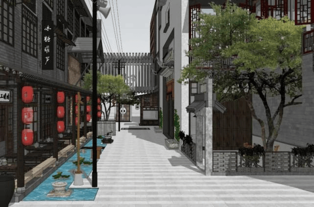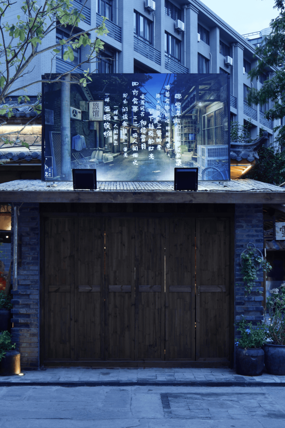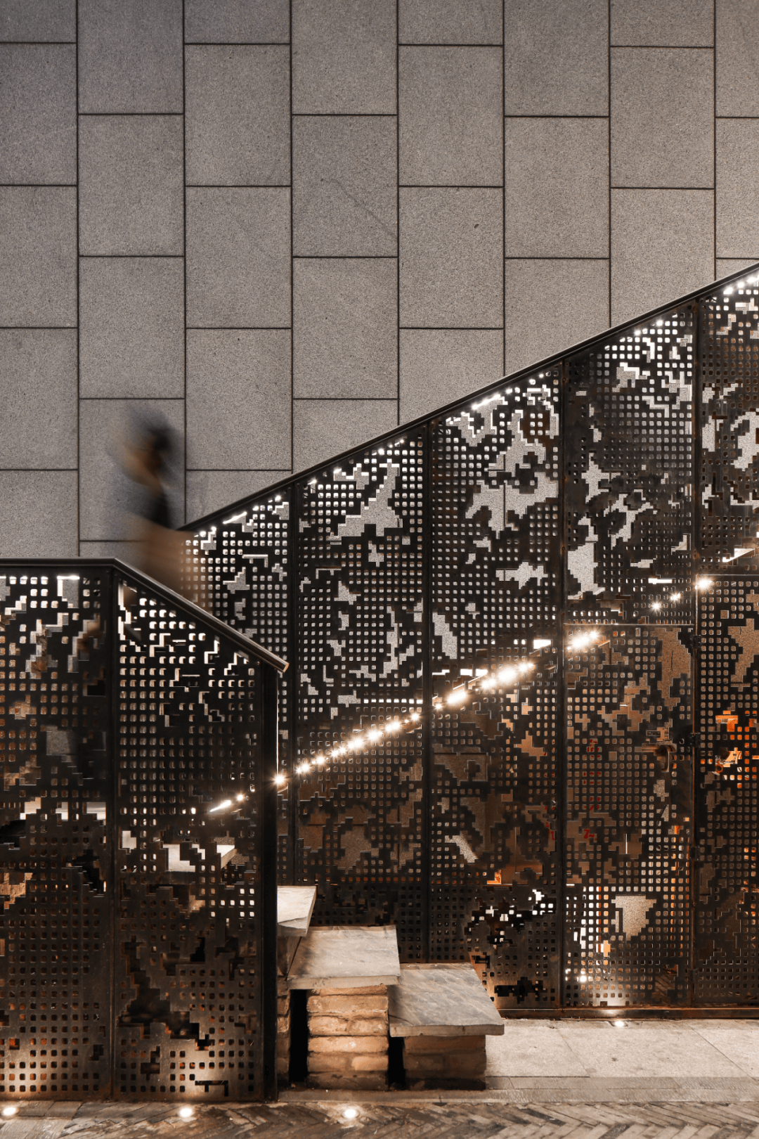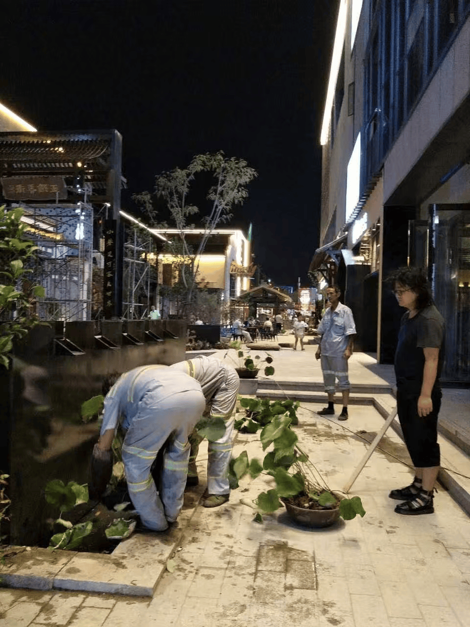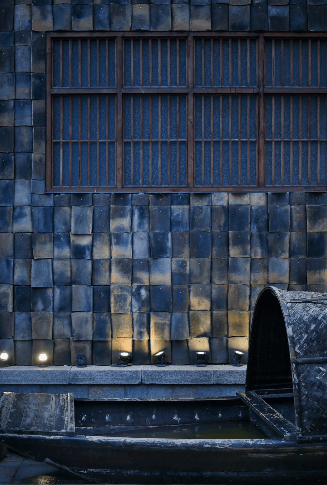 主街景观小品 最美的瞬间便是夜晚霓虹灯起,整座连廊透着柔光。又与周围星星点点的小品、灯带、雾化效果环绕渲染形成过去与未来的融合,美轮美奂。与三条街相连呈横轴的通道原本两边均为普通白墙,临街加盖特色小铺并将墙边的空调机箱与老旧电箱以钢板覆盖,借助街道的串接,将红砖、青砖、瓦片在每一间新建建筑外立面进行有规律镶嵌、组合,盎然生机的绿植盆栽生长于建筑边角,充分利用整条街区的空间,也提高了整个街区的艺术品质,将三条街形成完美联动。在视觉上,得到一种明朗素雅和层次分明的韵律美的享受。