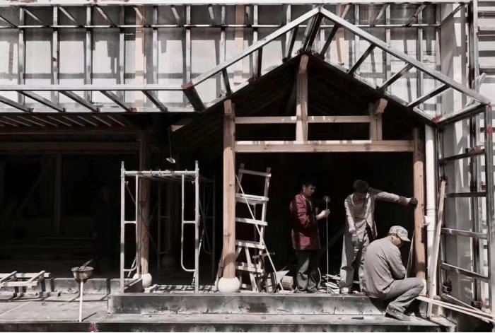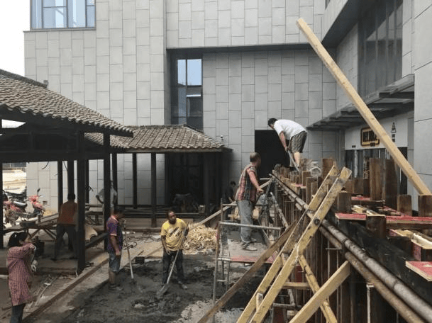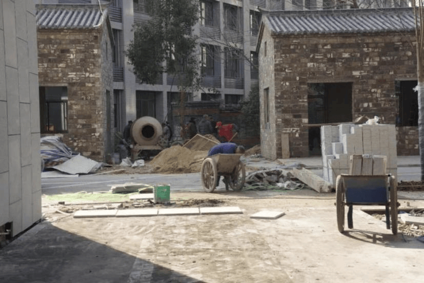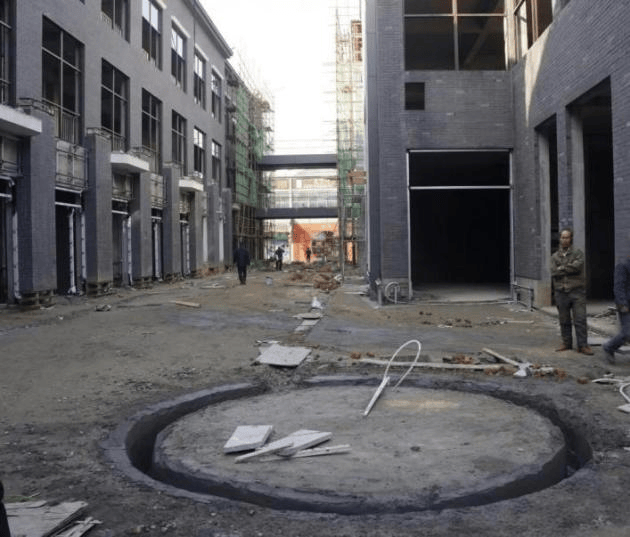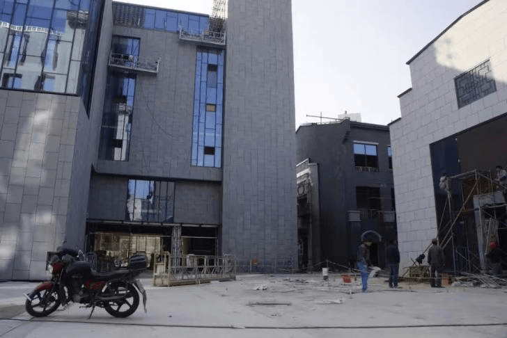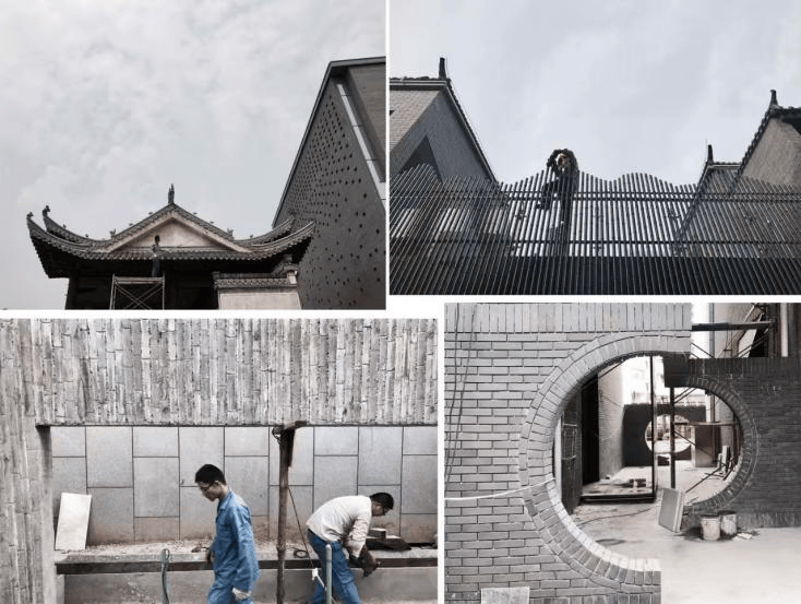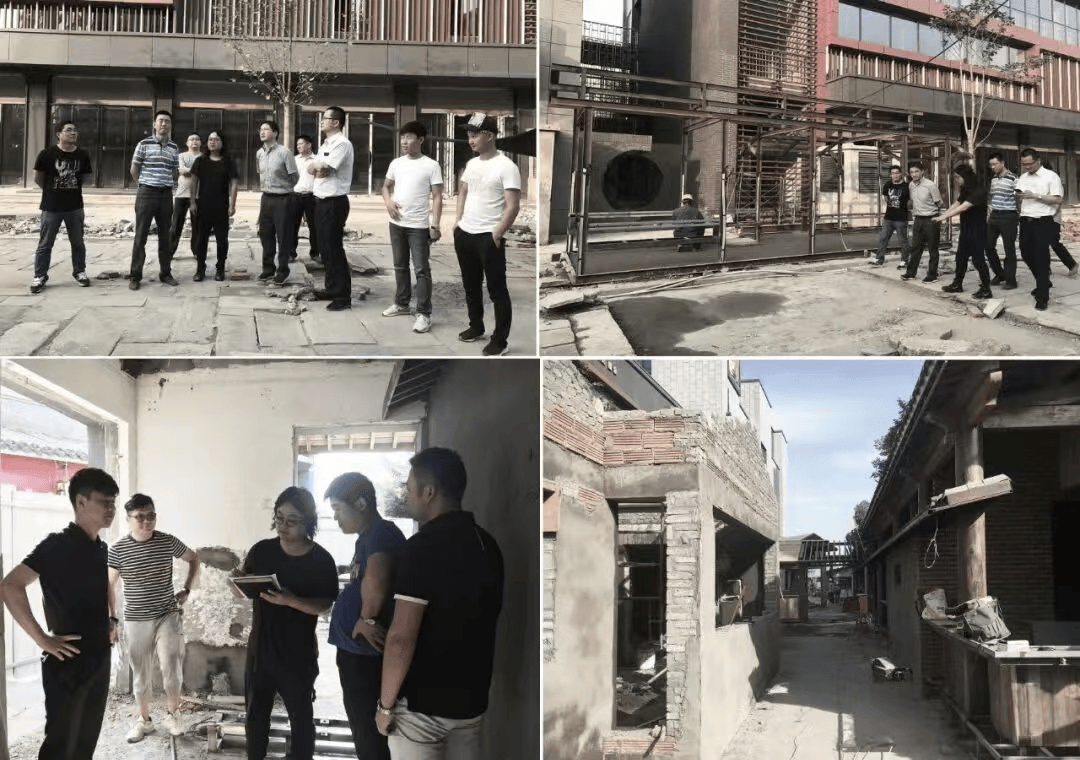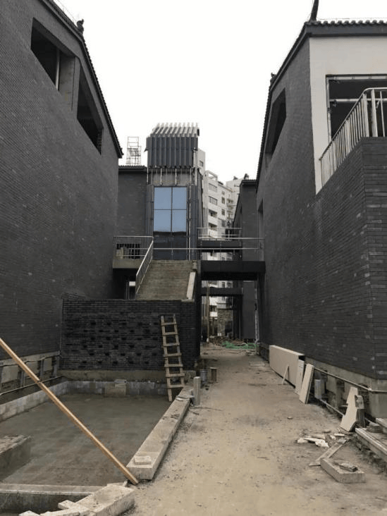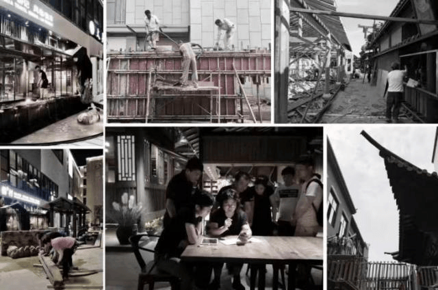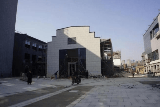 主街广场区域 原主街街面宽阔而萧条,周边有几座占地庞大而立面粗犷的店面构成,缺乏活力。改造后,封闭主街与东面马路的联系,将大空间引入相对闭合的小空间中,组合成为街巷的风貌,在街中巧妙的增添徽派风情元素高墙、斗拱、青铜宴雕塑、青石板、青砖、瓦片、砖雕、铁画等,通过设计重构,融入到景观设计中,点滴细节皆是老城合肥的剪影。 罍街二期改造过程