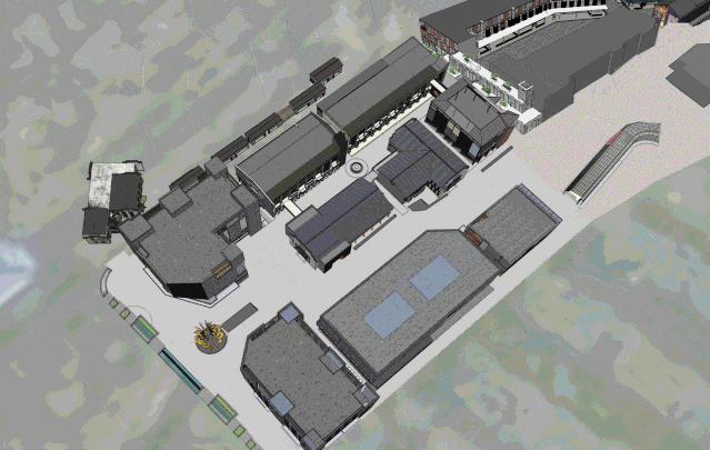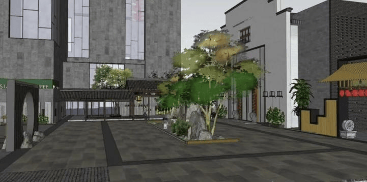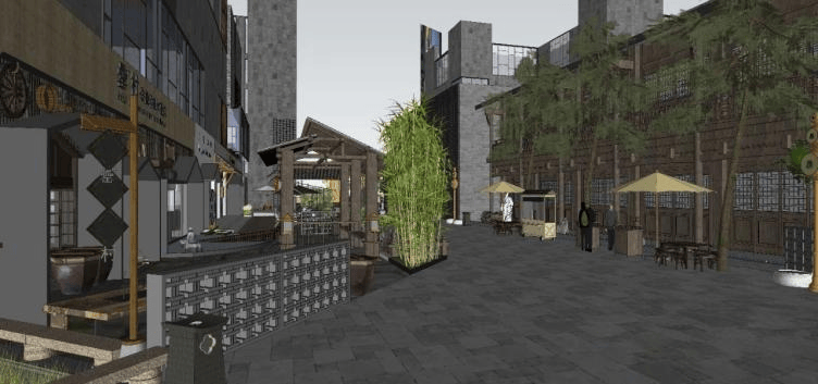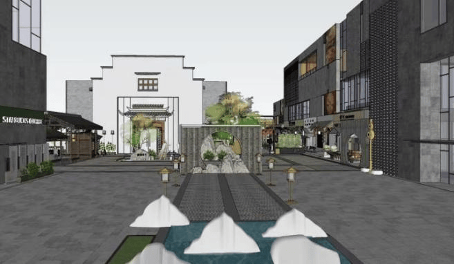 主街广场区域 向内置入内广场,与原广场形成多核联动,在街区内部延续传统院落文化、礼仪格局,保留“坊”、“巷”、“街”等传统印象。外围空间则以周边功能业态有机的联系在一起,设置景观小品、休闲座椅,丰富场地的空间体验,让行人能够参与其中与环境互动。