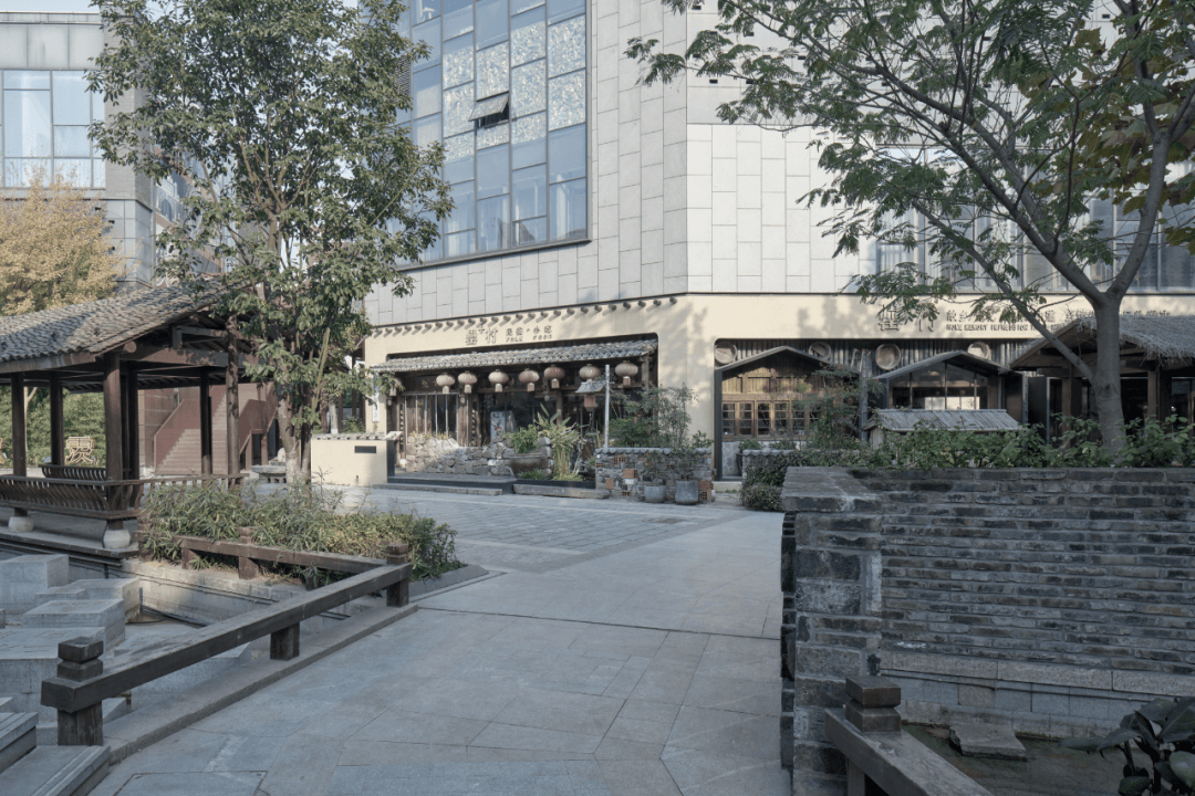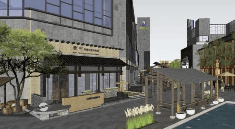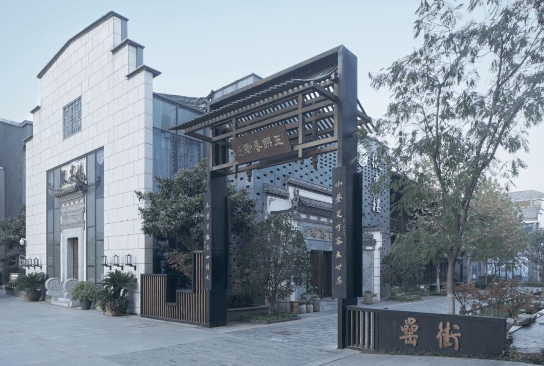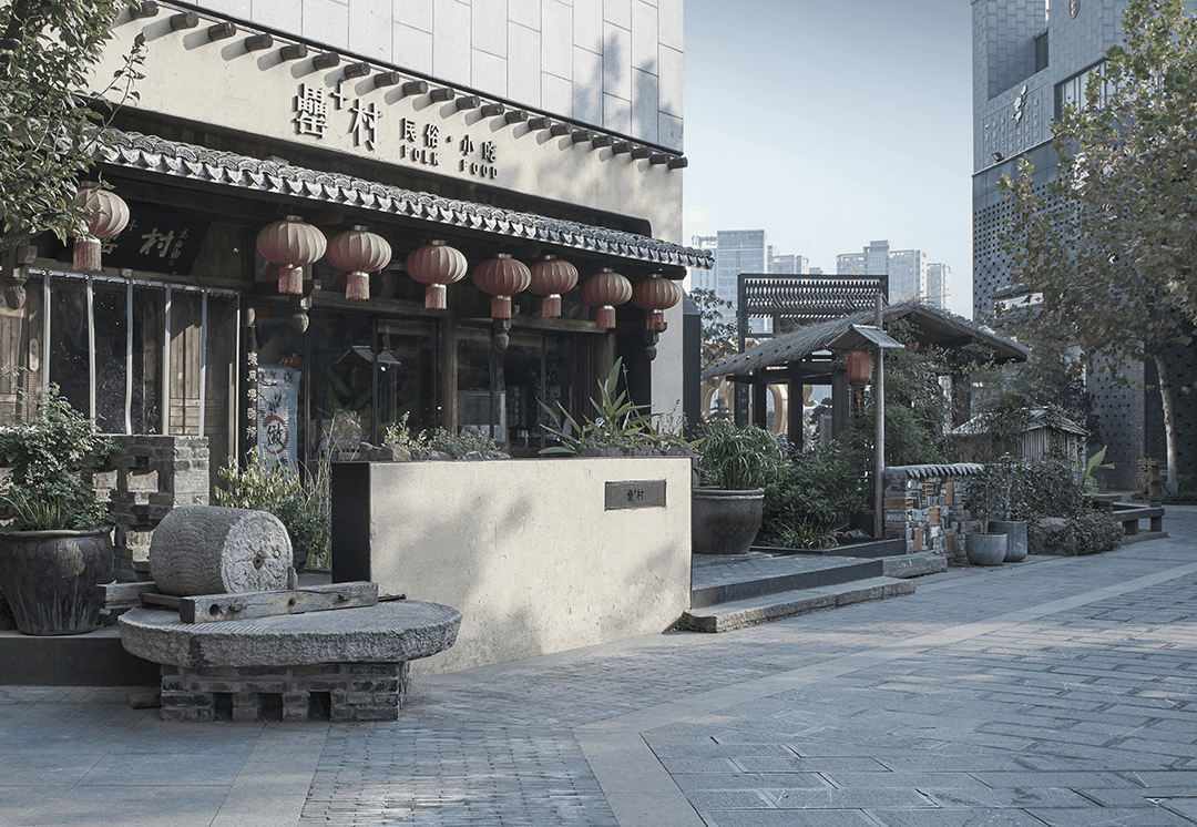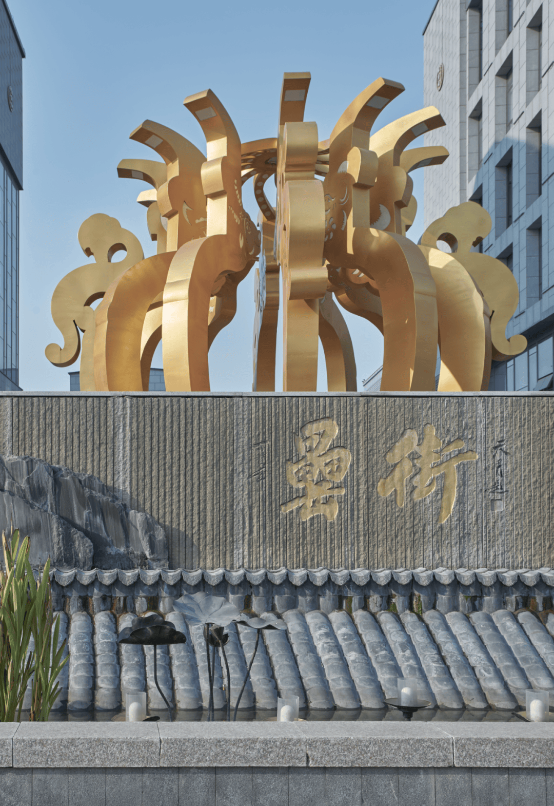 罍+村美食广场外景 曇+村对面地块为曇街大观、主街与合肥巷交界之处,原地块未曾被利用,仅为一块空地。作为整个街区的中心区域,毋庸置疑这里是最好的视觉中心,在此处建造徽式连廊,融合水景与镂空字体小品,又通过色彩、材质、尺寸、细节的处理,使空间连续而富有变化。