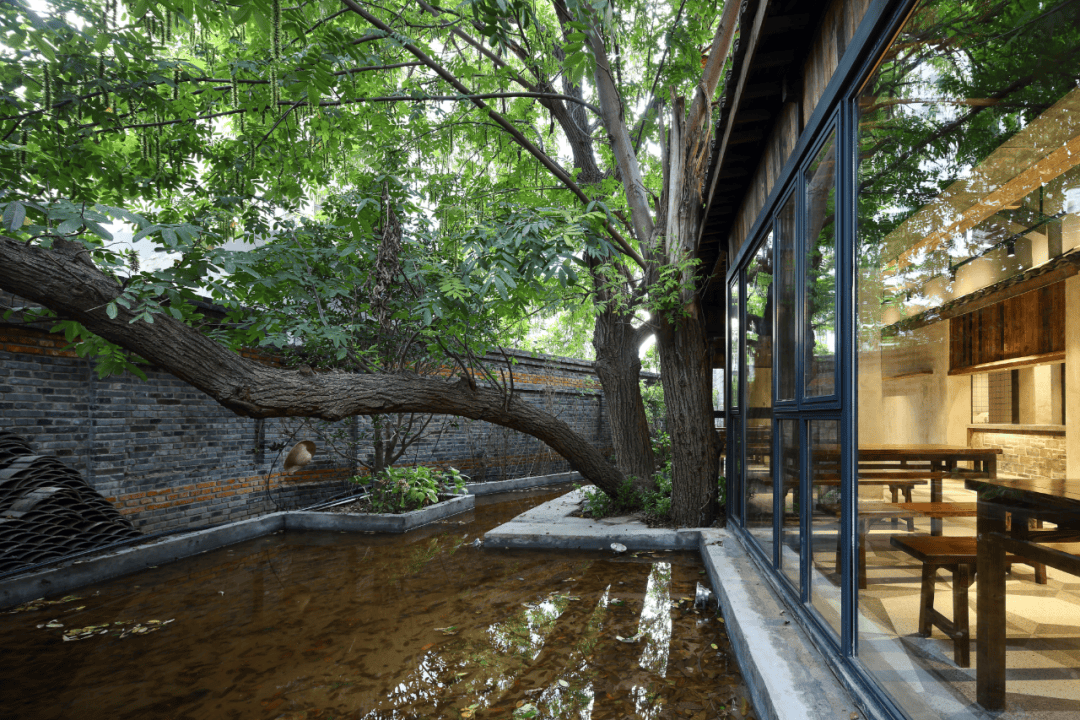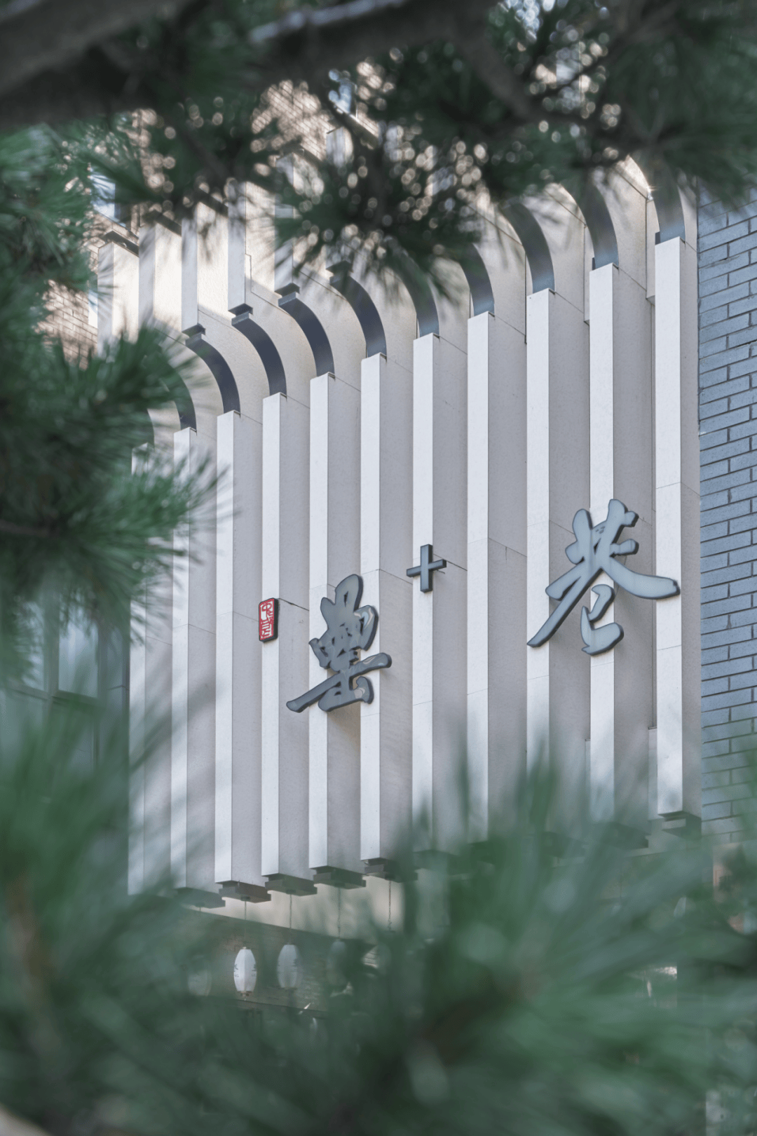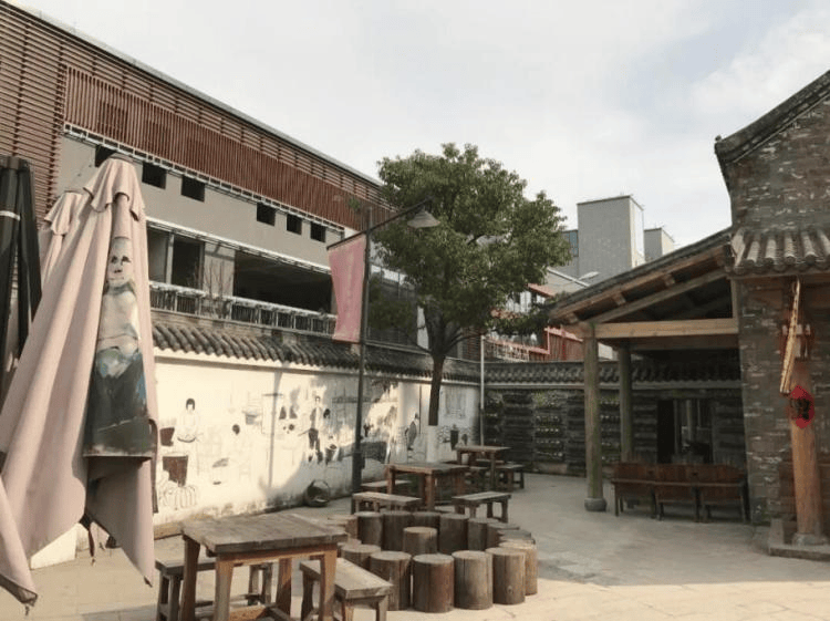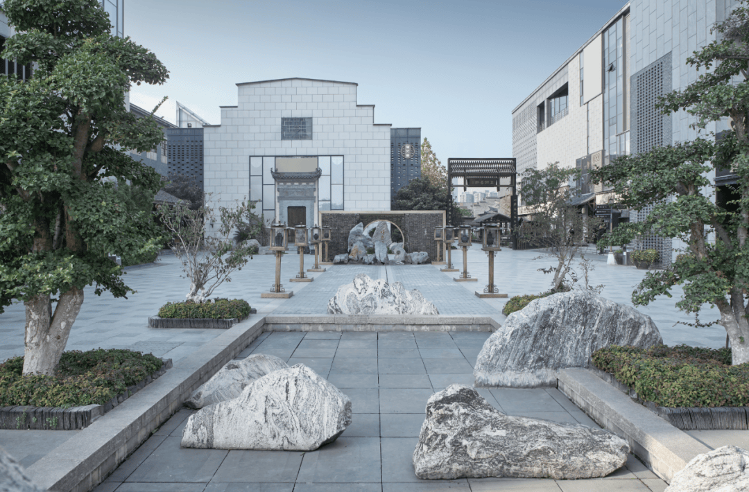 罍+村美食广场外景 曇+村对面地块为曇街大观、主街与合肥巷交界之处,原地块未曾被利用,仅为一块空地。作为整个街区的中心区域,毋庸置疑这里是最好的视觉中心,在此处建造徽式连廊,融合水景与镂空字体小品,又通过色彩、材质、尺寸、细节的处理,使空间连续而富有变化。