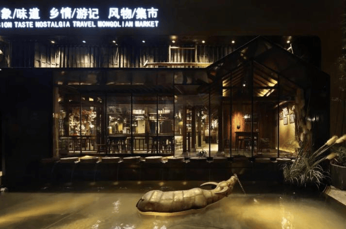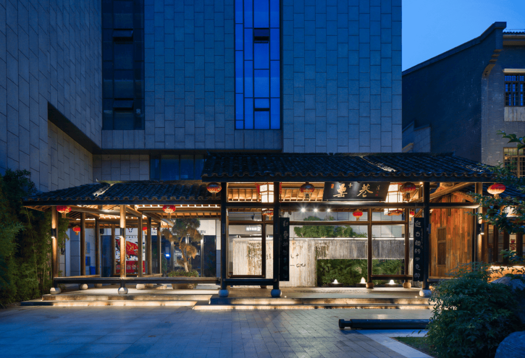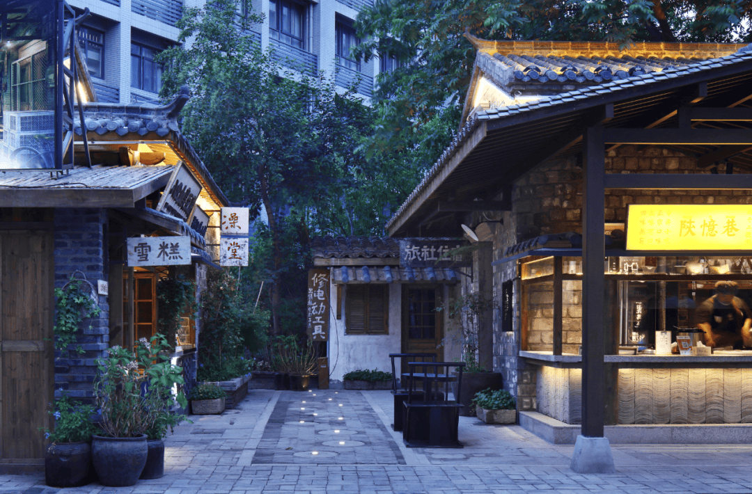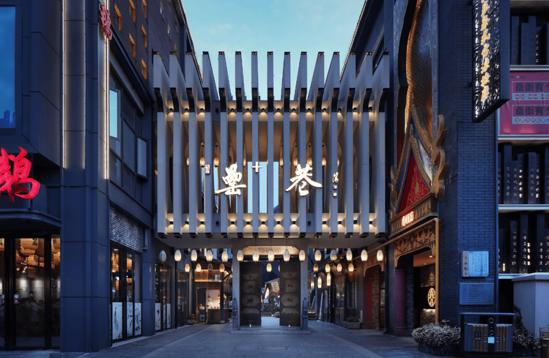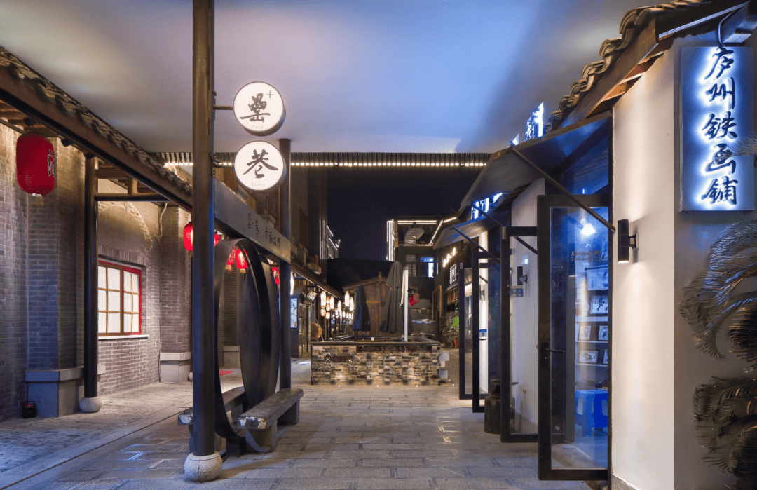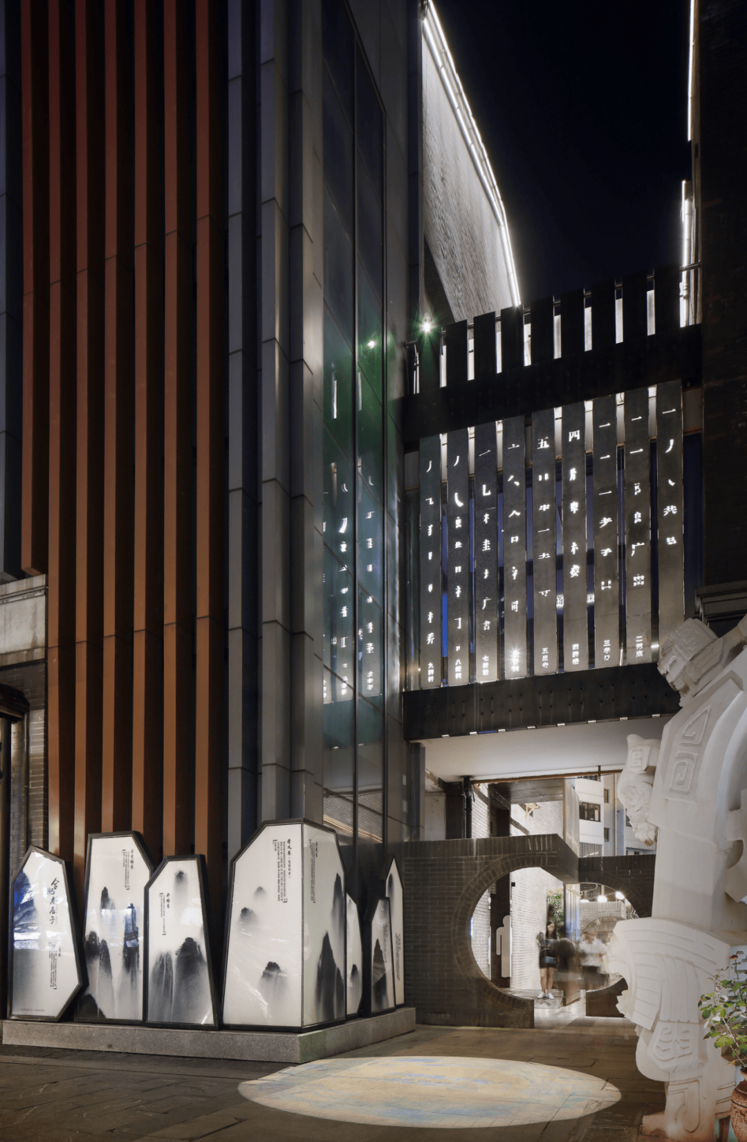 合肥巷夜景 合肥巷原本只是两边高大的楼宇之间的通道,街中空空荡荡,建国设计入驻改造后对巷子进行重新设计,对入口处的立面饰以片山为景增添标志性。