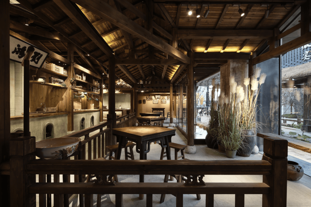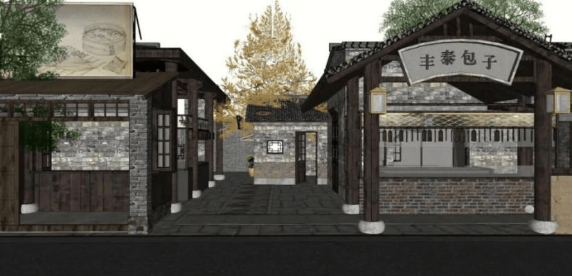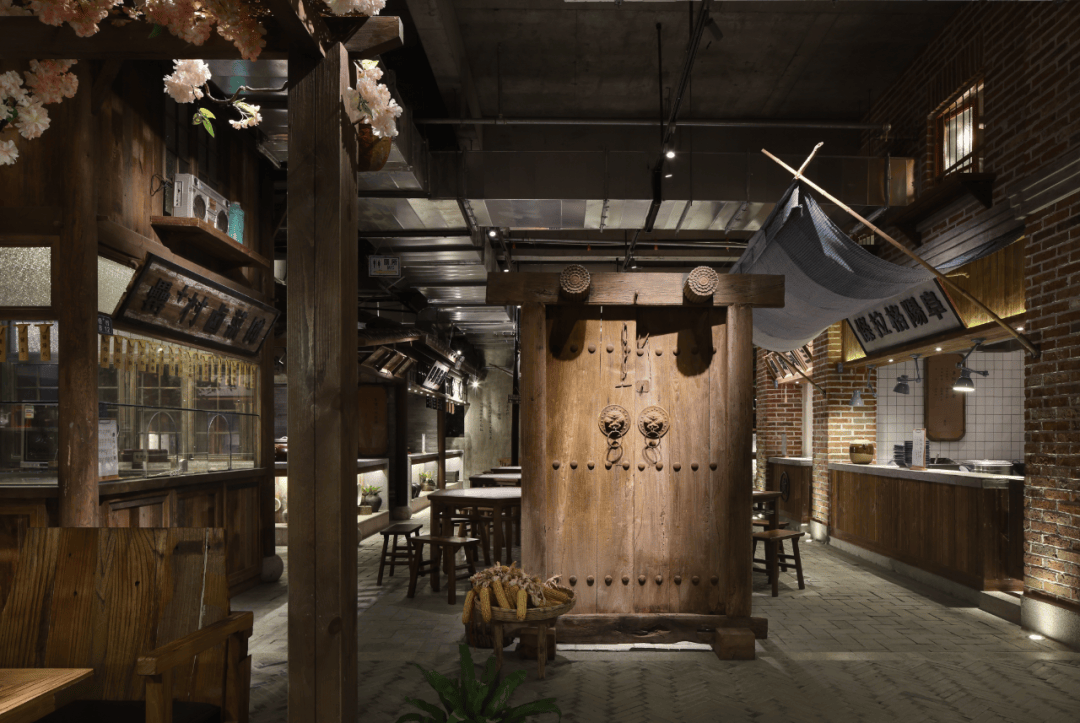合肥巷内街景观 沿街的早餐街以70—80年代风格的厂房为原型,采用多元化的地形结构,结合街区宽度与人流走向,在水泥与红砖之间的碰撞中,搭配木质明档,打造出复古却可亲的明档氛围,配合不同材质的地面铺贴与实木拼合,形成丰富的层次空间。