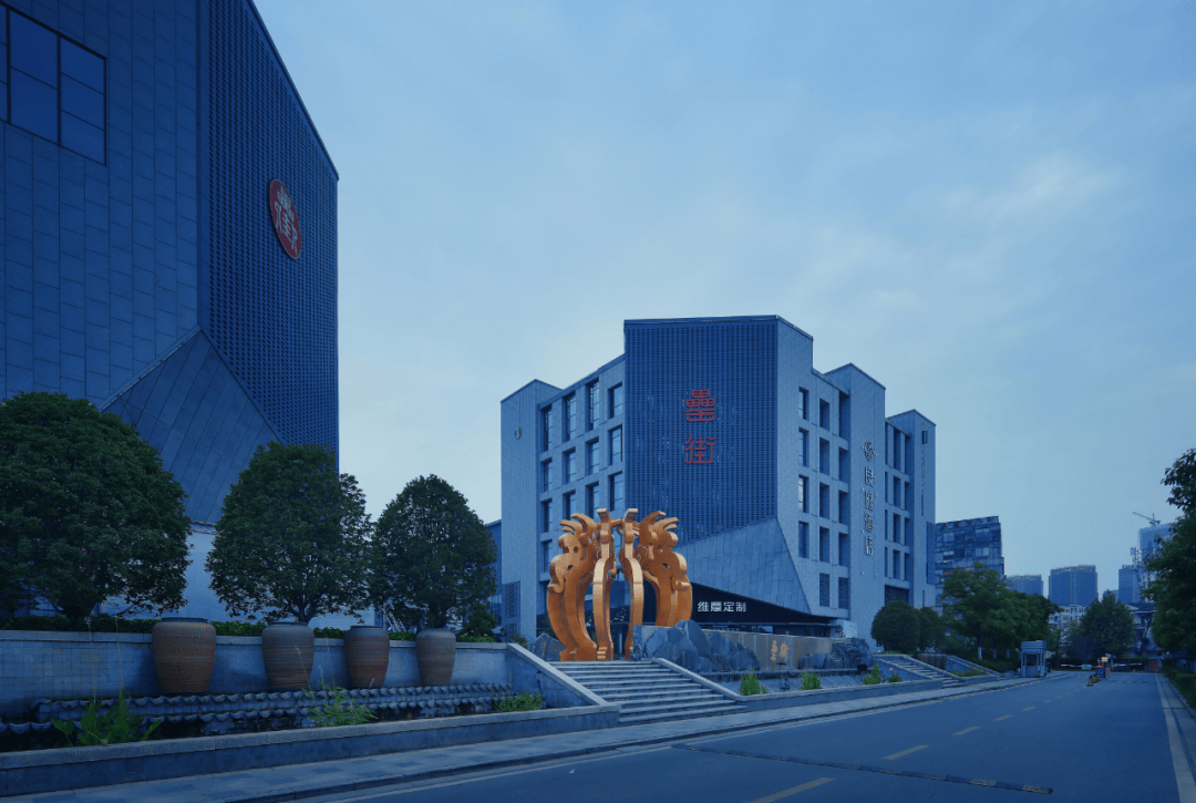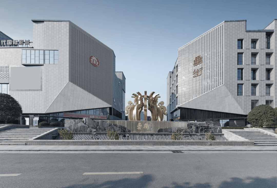 早餐街改造前后对比 许建国设计团队接手罍街项目改造任务后,在不拆除原建筑基础上,对其空间结构进行手术刀般的改造和调整:在广场雕塑背后下挖线形水曲、加建“以酒会友”景观小品、镂空石屏设置内广场,将其与北面的主街形成一条中轴线,行人可从广场透过石屏的拱形镂空一眼窥见罍街的巨大金色雕塑标志,利用水景与假山石景压低广场建筑的高度,从而从视觉上建立联系。