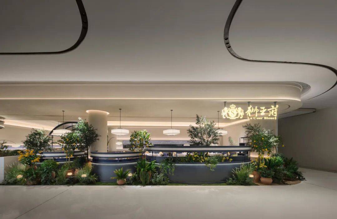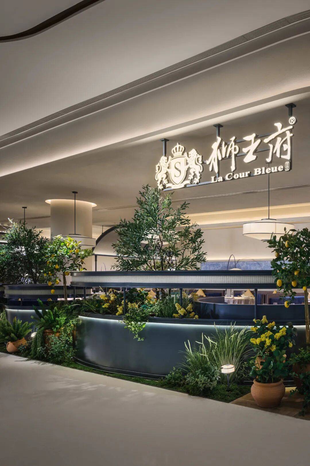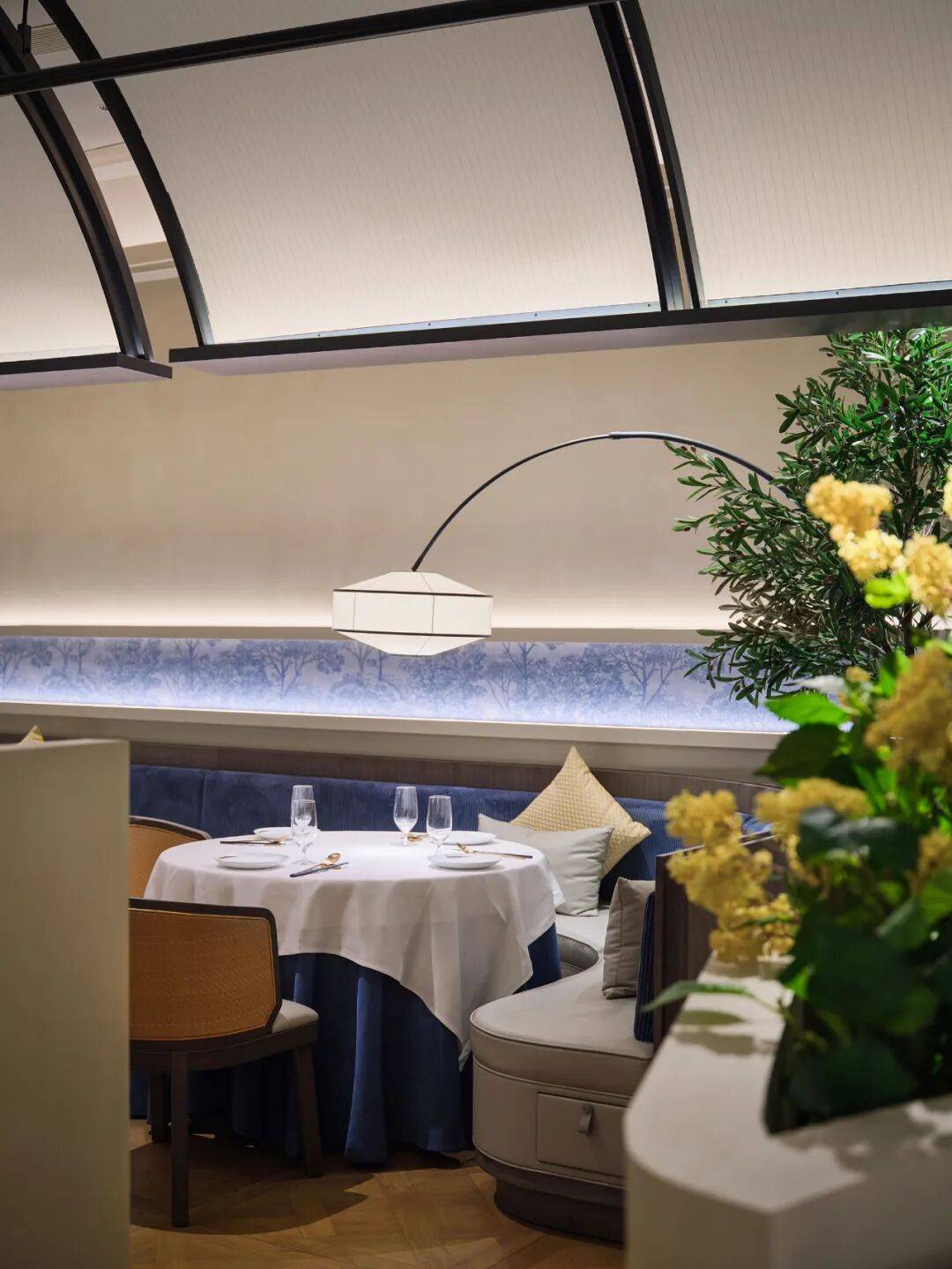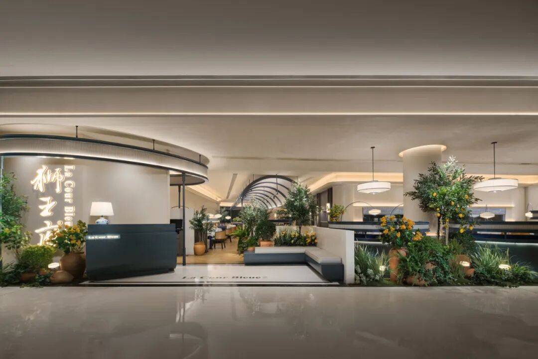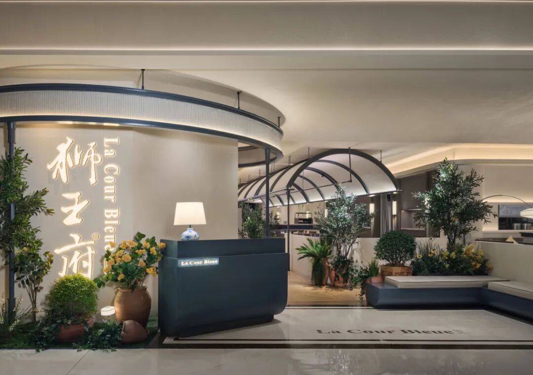 项目介绍 狮王府新店落址南京金陵天地,团队以轻量化设计延续品牌标志性的法式中国风,构建一处兼具东方雅韵与法式浪漫的蓝色庭院,让食客在自然亲和的氛围中尽享淮扬盛宴。