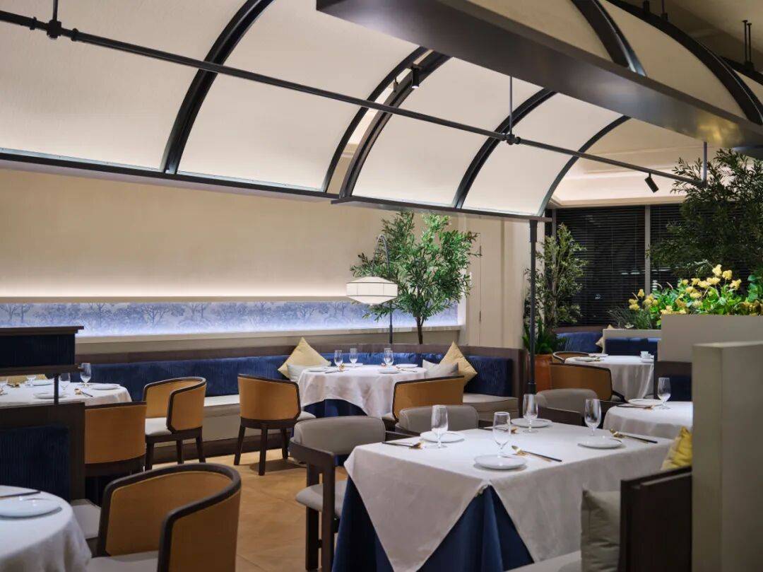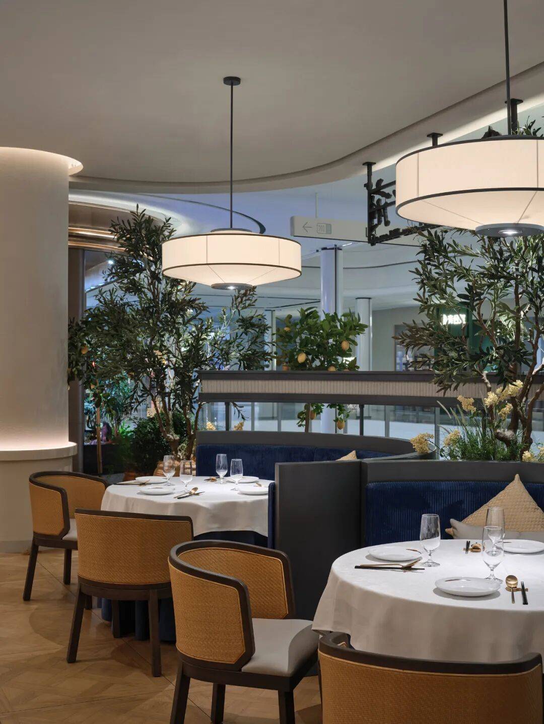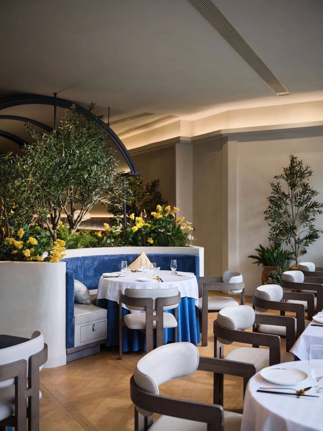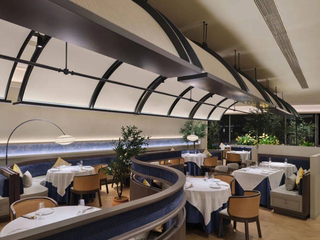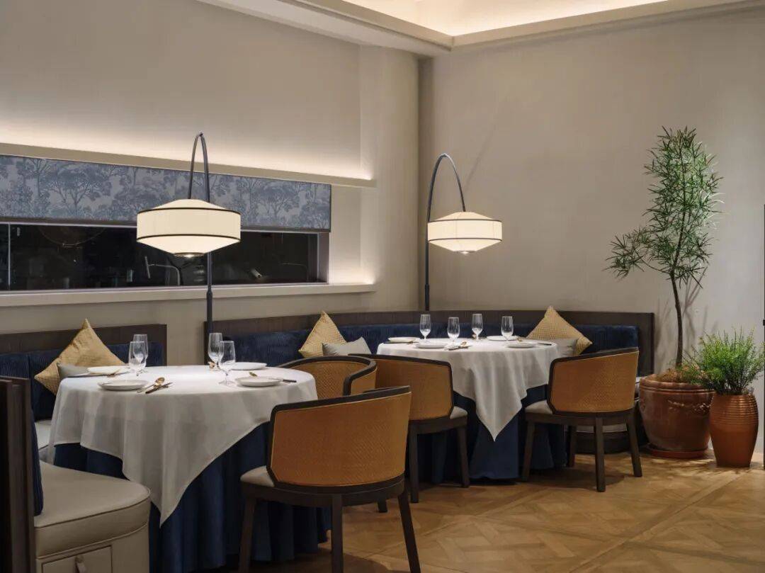 项目介绍 狮王府新店落址南京金陵天地,团队以轻量化设计延续品牌标志性的法式中国风,构建一处兼具东方雅韵与法式浪漫的蓝色庭院,让食客在自然亲和的氛围中尽享淮扬盛宴。