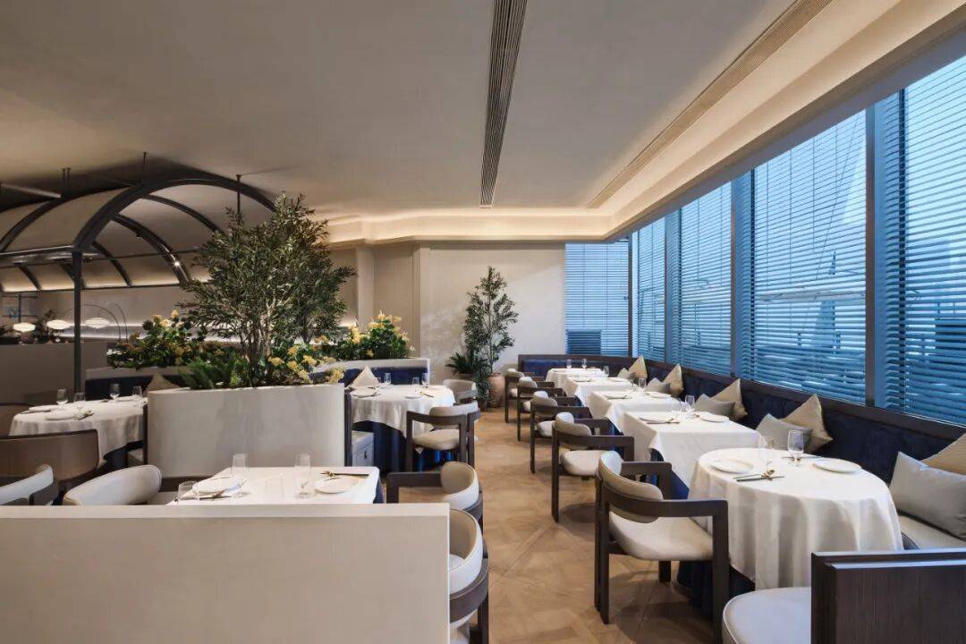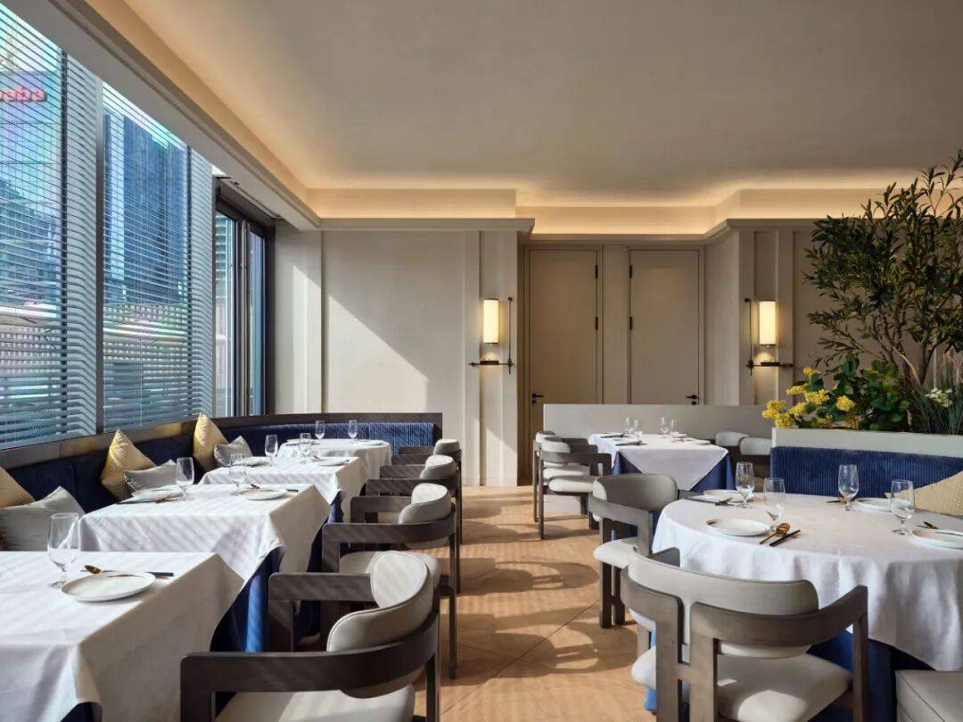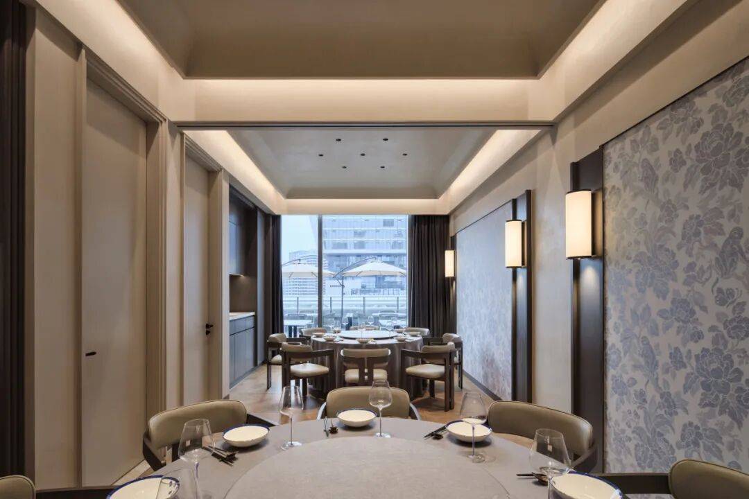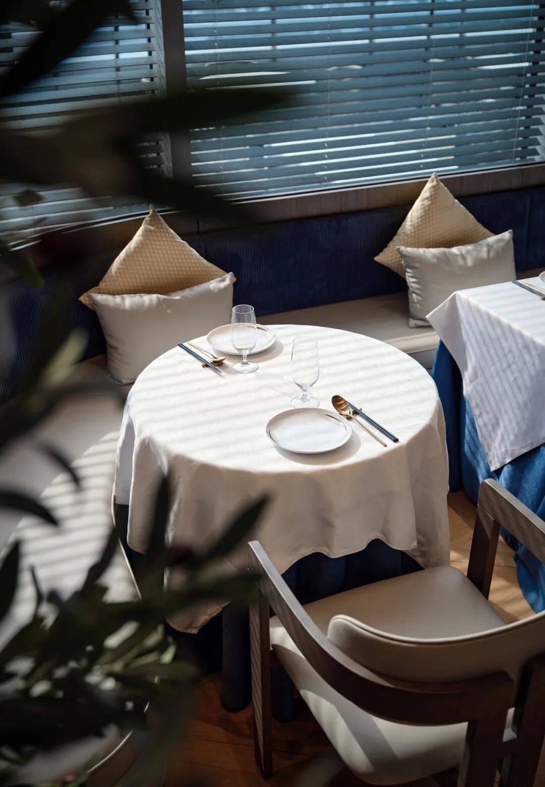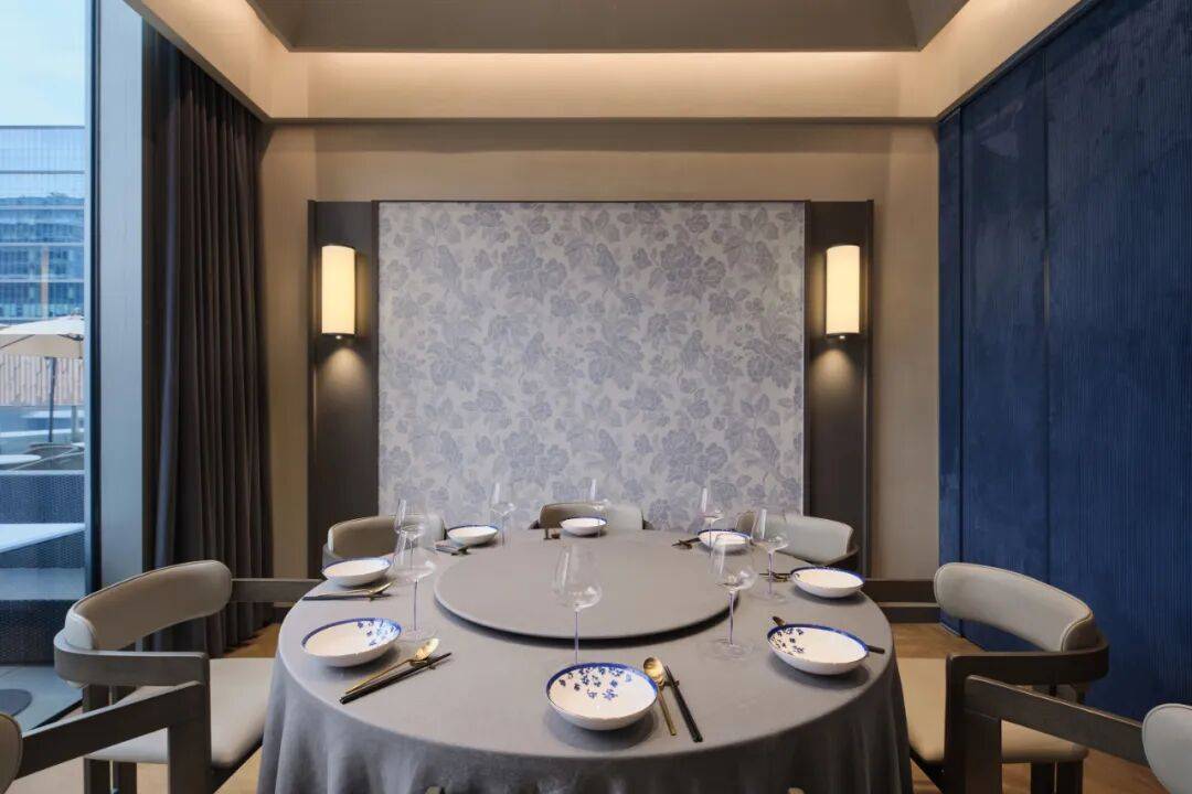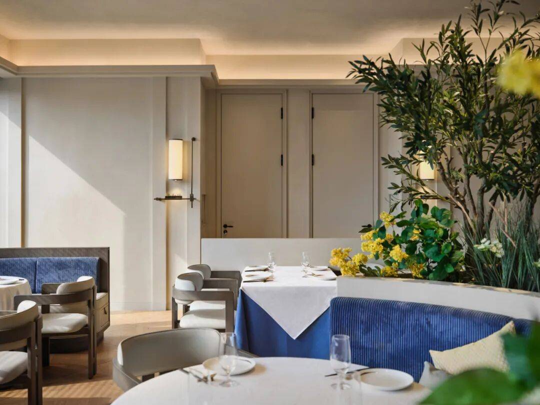 项目介绍 狮王府新店落址南京金陵天地,团队以轻量化设计延续品牌标志性的法式中国风,构建一处兼具东方雅韵与法式浪漫的蓝色庭院,让食客在自然亲和的氛围中尽享淮扬盛宴。