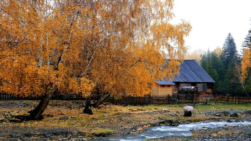 溪水在村边潺潺流过,水底的卵石被冲刷得圆润光滑。偶尔有落叶飘落水面,打着旋儿向下游漂去,像一封封寄给远方的信笺。对岸的山坡上,松树依然苍翠,与金黄的白桦形成鲜明的对比。这绿与黄的交织,像是大自然随手挥洒的调色盘,却又恰到好处地和谐。
