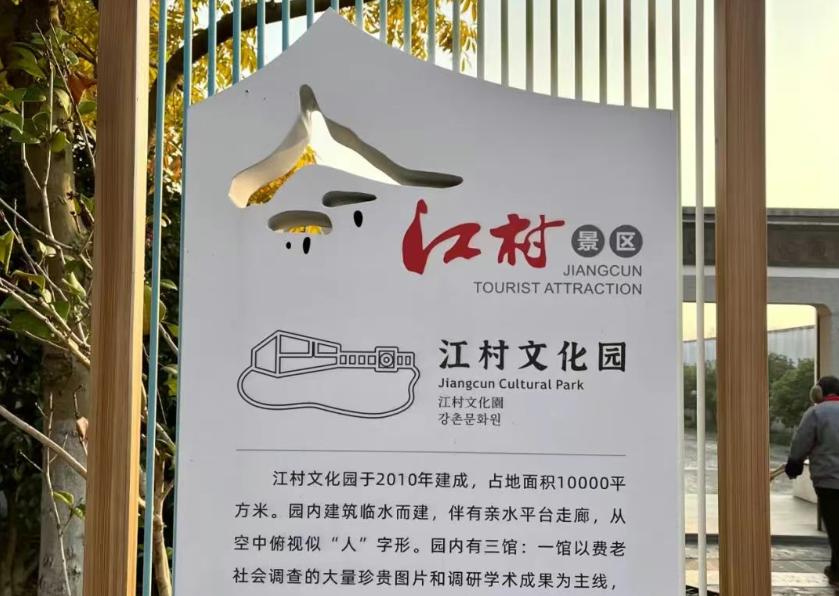 村落里建有江村文化园。该园有三个展馆:江村历史文化陈列馆、费达生江村纪念馆、费孝通江村纪念馆。 其中江村历史文化陈列馆展示了江村人文、风俗、美食及各类非物质文化遗产,充分展示江村文化的源远流长和深厚底蕴。