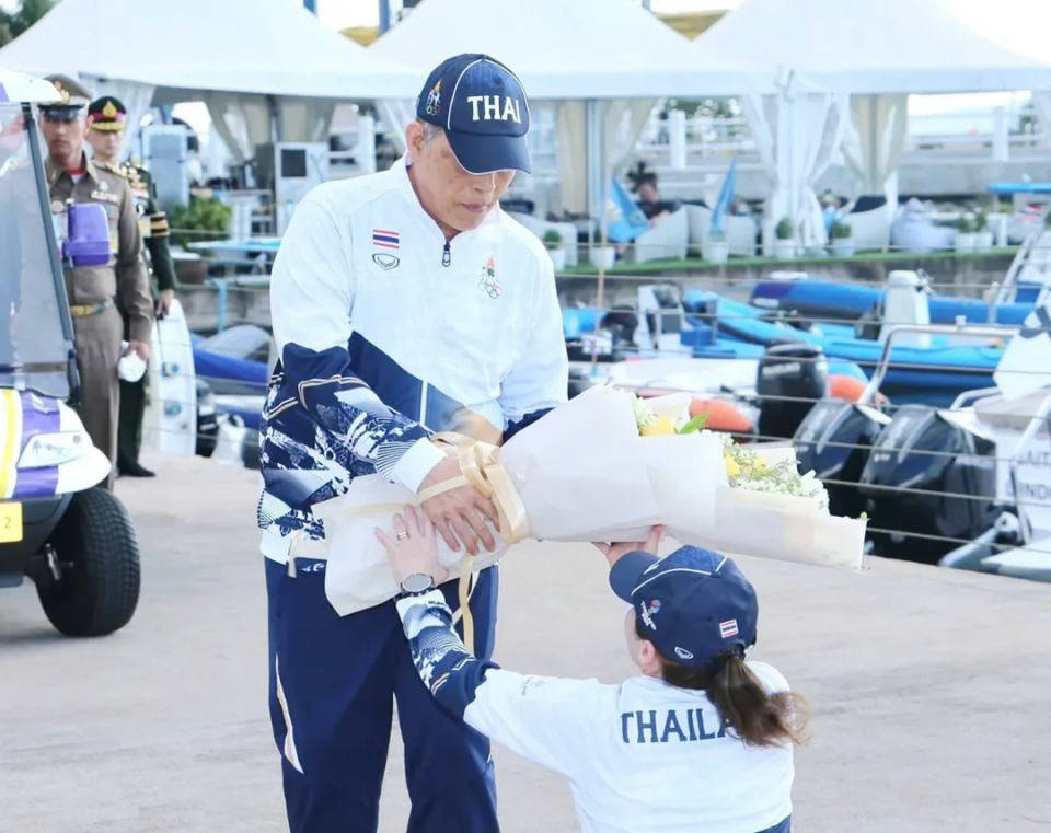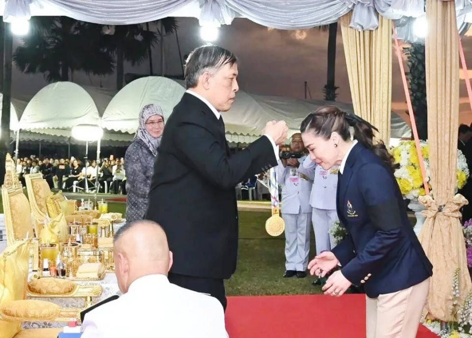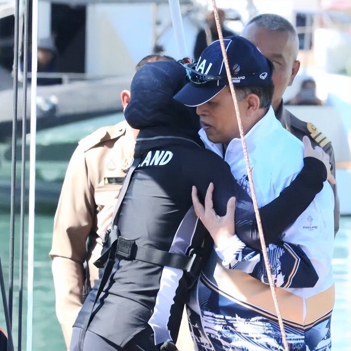 当苏提达接过泰王递来的花束时,恪守王室等级礼仪的她以跪姿相接,尽显恭谨;而在登船前,两人罕见当众拥抱,短短几秒的温情相拥,打破了王室的疏离感,让观众窥见这对夫妻间的微妙情愫。泰王为她佩戴金牌后,更细心整理奖牌绶带,苏提达灿烂的笑容里,藏着荣耀与被疼爱的双重喜悦。