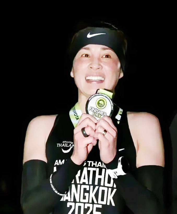 马拉松装扮:在曼谷半程马拉松中,她身着轻便运动套装,以2小时13分40秒的成绩完赛。赛后仍站在终点为选手加油,运动穿搭的舒适感与活力感让她在5万名参赛者中格外亮眼。