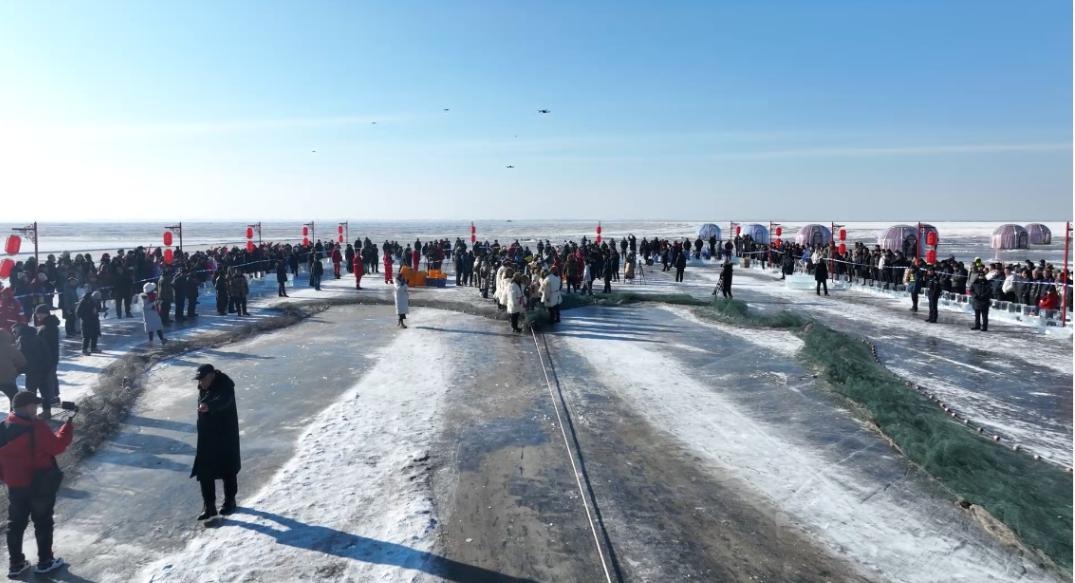 游客从四面八方涌来 只为见证最激动人心的“冰湖腾鱼”时刻 当一声响彻湖面的“起网喽” 划破长空 巨网从冰洞中被缓缓拉出 成百上千尾肥硕的鲜鱼 噼里啪啦地跃上冰面