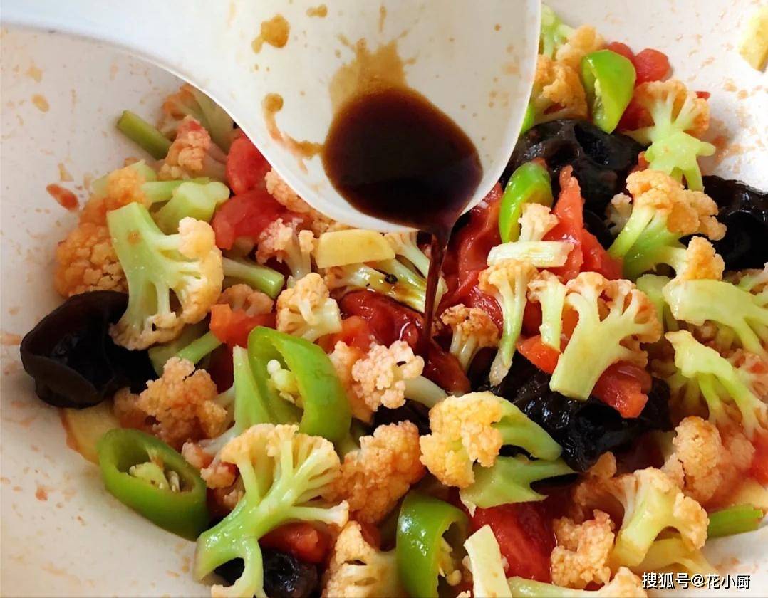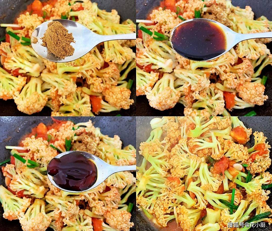 3、接着,把洗好的花菜倒进锅里。这时候就得用铲子使劲翻炒啦,让花菜都裹上西红柿的汤汁。翻炒个一分钟左右,就可以调味啦。先撒点盐,鸡精、十三香、两勺生抽、一勺蚝油,接着继续翻炒,让调料和花菜、西红柿充分地融合在一起。等你觉得差不多了,这道菜就算大功告成啦!