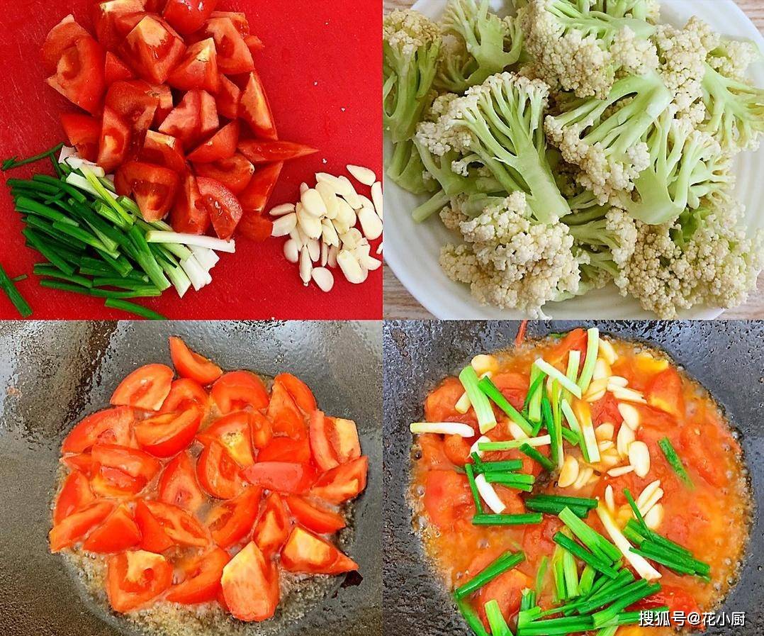 1、西红柿得挑那种红彤彤、软乎乎的,这种炒出来容易出沙,味道也好。把西红柿洗干净,切成小块,放一边备用。再把有机花菜拿出来,用手把它掰成一小朵一小朵的,放到水龙头底下,仔仔细细地清洗干净。大蒜剥几个蒜瓣,切成薄片,小葱切成小段; 2、先把锅烧热,然后倒点油进去。等油热了,就把切好的西红柿块一股脑儿倒进锅里。这时候火得小点,慢慢炒。等西红柿炒出沙了,把切好的蒜片和小葱段也扔进去;