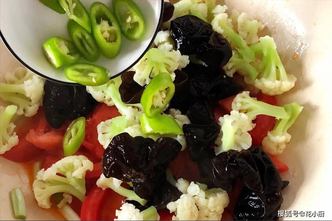 食材:花菜、西红柿、黑木耳、几个杭椒、葱姜、生抽、食盐、蚝油 1、把花菜洗干净,掰成一个个小朵。黑木耳得提前泡发,泡软就行。然后烧一锅热水,把花菜和黑木耳放进去焯烫一下。