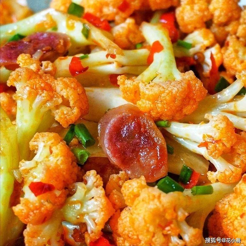 5、这时候把之前煮好的花菜放进锅里。花菜一入锅,就和锅里的腊肠、调料们来了个亲密接触。用铲子把它们翻来翻去,让花菜均匀地裹上调料的味道。然后把刚才调好的碗汁也倒进去,继续翻炒。炒着炒着,你就会发现花菜的颜色变得更鲜亮了,香味也越来越诱人。