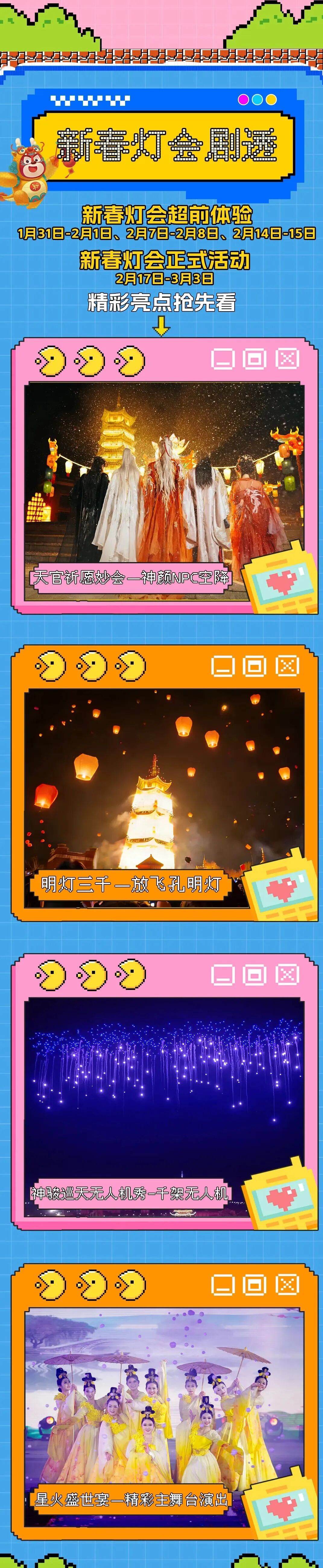 图源:济南方特东方神画 tips 小贴士 开园全天特惠票:1月31日—2月15日 新春全天特惠票:2月17日—3月3日 新春夜场特惠票:1月31日—2月1日、2月7日—8日、2月14日—15日、2月17日—3月3日(15:00 入园) 新春灯会剧透 济南方特新春灯会融合传统年俗、科技光影与沉浸式互动,主打 "骏马迎春・神骏巡天" 特色。核心活动亮点惊喜不断,沉浸式感受新春氛围。