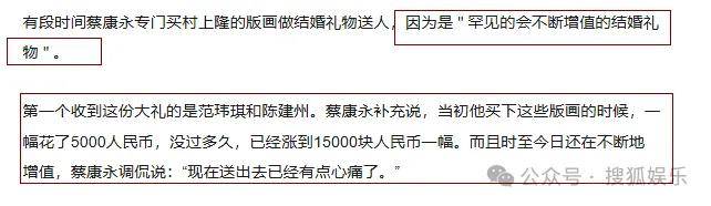 蔡康永说这些画是“罕见的会不断增值的结婚礼物”,第一个收到这个礼物的是范范和陈建州,他买的时候是一幅5000人民币,送范范的时候就涨到1万5了。