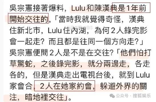 当时吴宗宪爆料,陈汉典和Lulu明明住两个地方,但下班总是一起走,还是往同一个方向走,于是他就起了疑心,主动去问二人是不是在交往哈哈哈哈哈~ 被吴宗宪发现后,陈汉典和Lulu就更小心了,下班分开走,再在女方家会合。