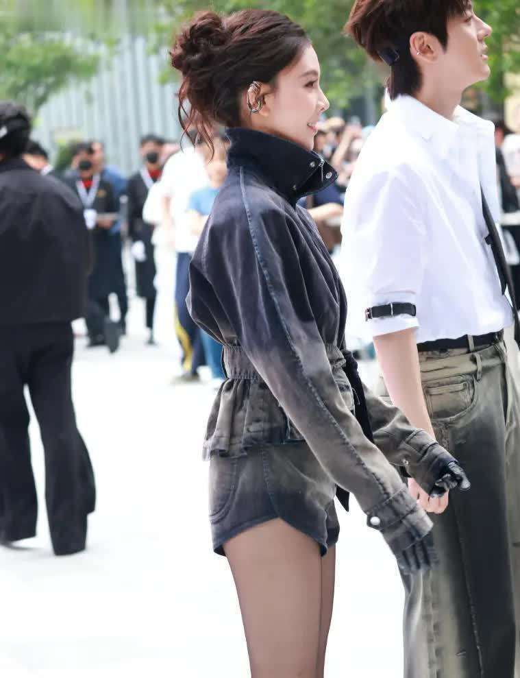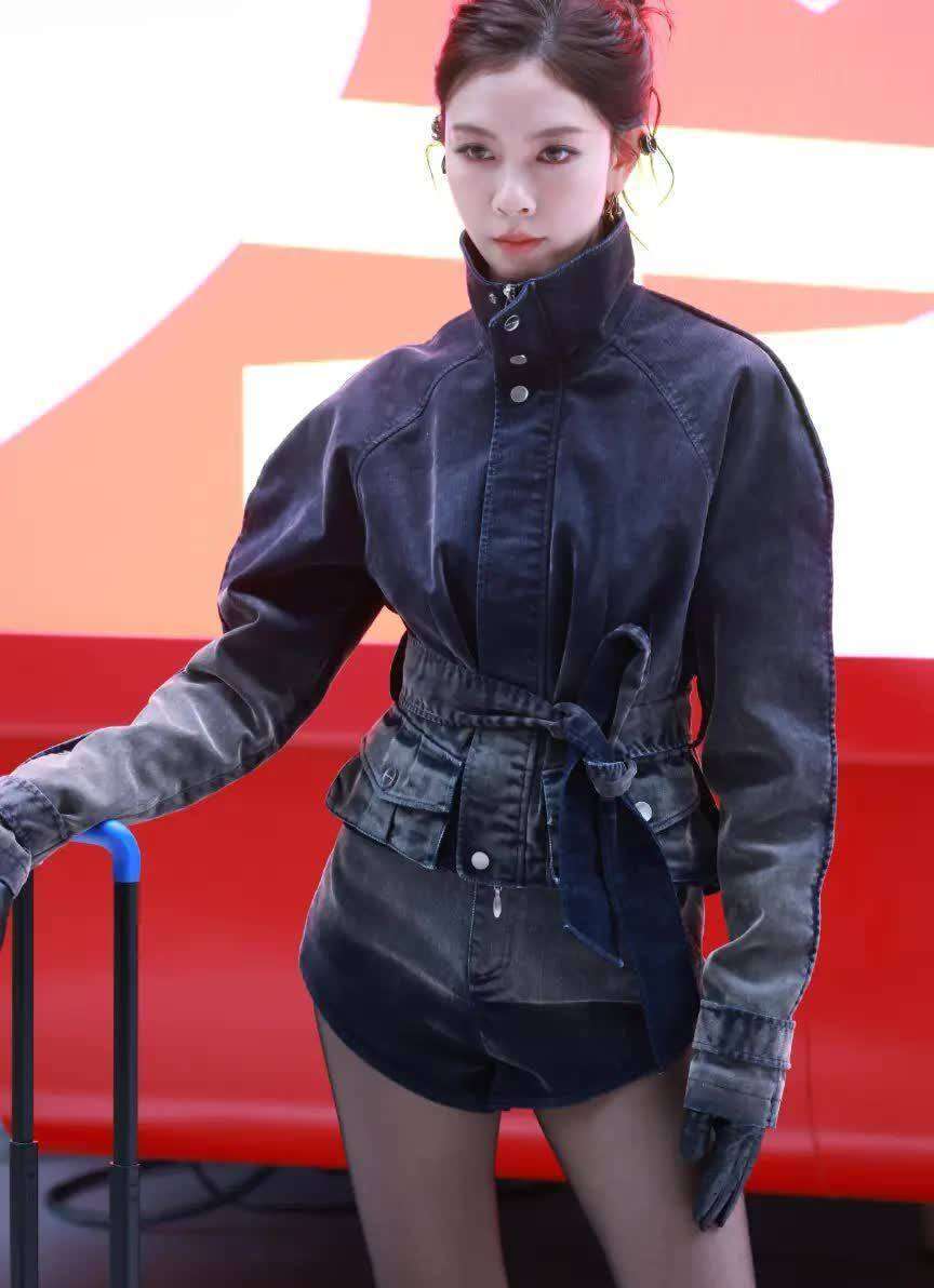 她的立领牛仔夹克与复古牛仔短裤的搭配,既显高又充满了时尚感。虽然短裤通常被认为是小个子福音,能在视觉上拉长腿部线条,但穿在高挑的宋妍霏身上,反而更加突出了她修长的大长腿,让整个造型显得更加完美。黑色尖头高跟鞋的搭配,更加突显了她的优雅与性感。夹克的立领设计加上腰带的点缀,使得整体造型多了一份帅气与个性。而她的复古盘发造型,搭配上精致的全包眼线,使她的白皙皮肤看起来格外高级,整个人散发着一种优雅的气质。