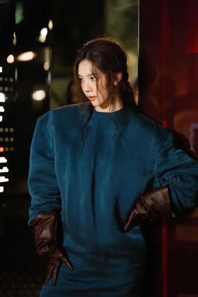接下来,这件蓝色垫肩长袖短裙,带有复古的设计感,极具性感魅力。垫肩的设计让她的肩部线条更加优美,短裙的设计突显了她的长腿,而复古棕色的卷发与高跟鞋的搭配,完美地削弱了裙装的厚重感,使整身造型更显轻盈。她搭配的棕色皮手套,更为整套造型增添了几分大气与复古韵味。而她那别致的复古龙须刘海设计与低扎发型,宛如一幅精致的油画,给人一种优雅少女的感觉,完美诠释了复古风与现代性感的结合。