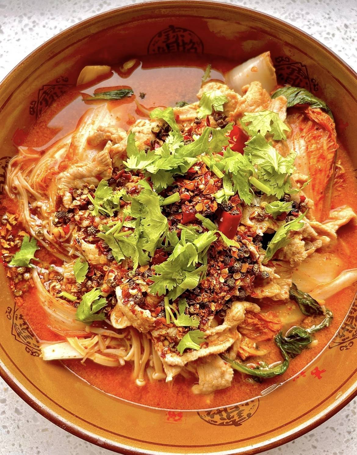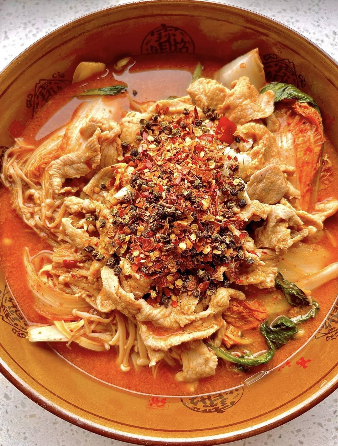 重头戏在于肉片的下锅。保持汤汁微沸的状态,将腌制好的肉片一片片均匀地滑入锅中,千万不要一股脑倒进去,否则肉片容易粘连成团。待肉片变色、浮起,立刻关火,整个过程不过几十秒,时间久了肉片就会变老。将煮好的肉片连同汤汁一起倒入铺好配菜的大碗中,这时候的肉片白嫩诱人,静静地躺在红油汤底上。