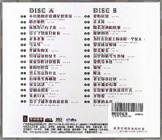 专辑曲目: CD1 01. 烟花易冷 02. 传奇 03. 真的不愿再把你想起 04. 你是不是心里还有别人 05. 台语歌(歌名不详) 06. 为你等待 07. 爱比不爱更寂寞 08. 冷冷的夏 09. 你是我一生最爱的人 10. 天使的翅膀 11. 爱情错觉 12. 不要用我的爱来伤害我 13. 爱情买卖 14. 爱是你我 15. 我睡在你眼睛的沙漠里 16. 当我孤独的时候还可以抱着你