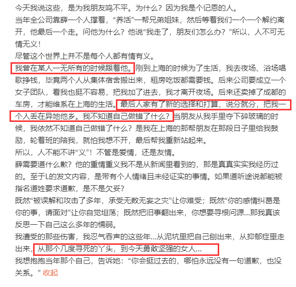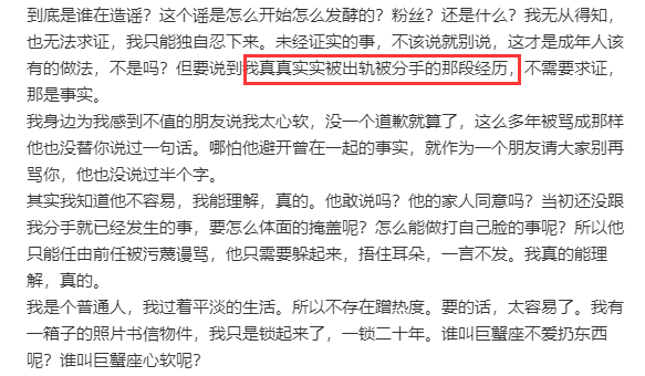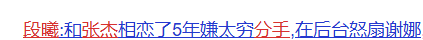 这就很令人遐想了。 段曦委屈说,自己在对方一无所有的时候就跟着他,为了能在上海生存,甚至卖了成都的车房,最后人家有了新选择,说分就分,她都不知道自己错在哪里,一度抑郁自残。(注意:段曦全篇没有写张杰的名字,全是用他、对方、人家以及某人指代)