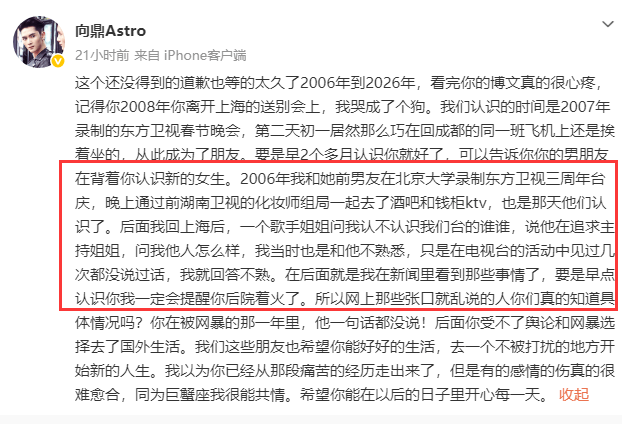 所以,谢娜和张杰认识到底是2006年12月还是10月呢?很大可能是张杰记错时间了,或者当时媒体写错了张杰所说的时间?毕竟谢娜不可能在10月记录12月发生的事情。 我们再看段曦朋友向鼎的说法。 他力挺段曦的时候说,2006年,他和段曦前男友(注:此人也没有直接提张杰大名)一起在北京大学录制了东方卫视三周年台庆,晚上通过湖南卫视化妆师组局一起去了酒吧和KTV,并爆料称:“那天他们(张杰谢娜)认识了。” 向鼎说,不久后,他就被一个歌手姐姐问认不认识我们台的谁谁,说他在追求主持姐姐......他遗憾说,可惜那会儿还不认识段曦,否则一定会提醒她后院着火了。