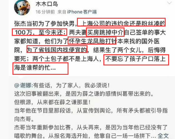 其转发谢娜的微博,并历数杰娜夫妻的旧事(真假未知哈): ①张杰没还粉丝为他凑齐的违约金。 ②夫妻俩上海买房跳掉中介。(谢娜张杰方曾发律师声明,辟谣跳单等为不实信息) ③想生龙凤胎为省钱找国内医院,结果生了双胞胎女儿,很后悔。 ④小孩落户上海是找人帮忙的。