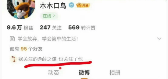 显然,薛之谦这边肯定不能单方面受骂。 就在谢娜痛批薛之谦后不久,薛之谦的朋友坐不住了,纷纷站出来为薛鸣不平。 其中这位微博ID为木木口鸟的网友格外显眼。(薛之谦微博关注了此人)