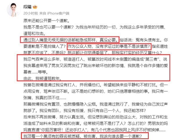 可万万没想到的是,昨天晚上,张杰前女友段曦竟然本人发声了,且她显然是站在薛之谦这边的。 她先是指责谢娜随便听了李雨桐的几句话就急了: “通过别人嘴里无根无据的话都能急成那样,真没必要。” “作为公众人物,没有求证过的事是不是该慎言?” 另外,她对于谢娜和薛之谦要道歉很不满。 段曦说自己因为张杰和谢娜被骂了那么多年,受了无数委屈,“我该向谁去要一个道歉?”