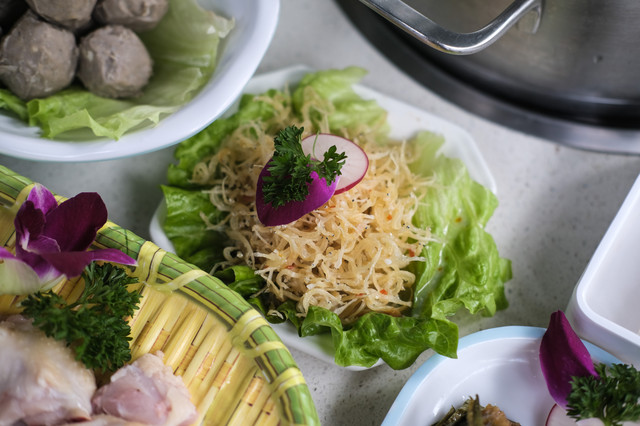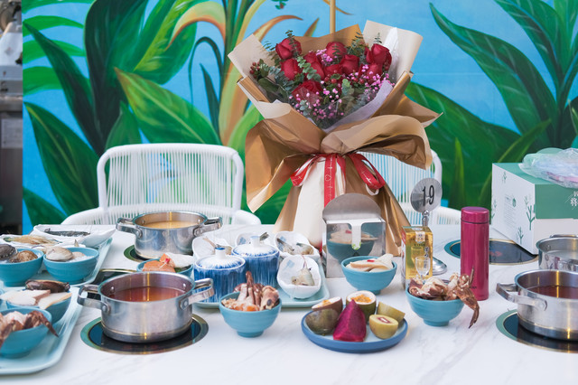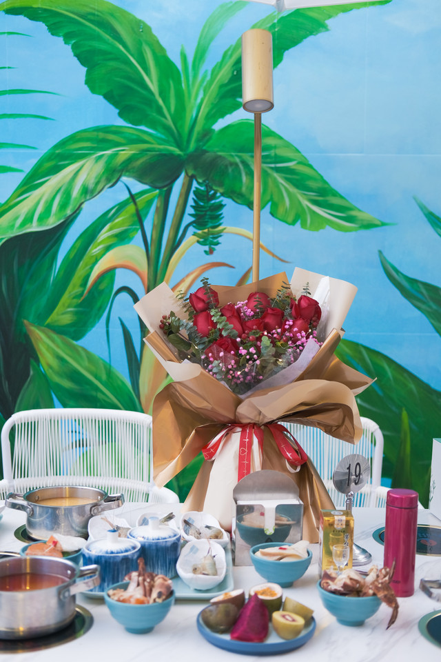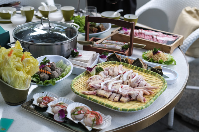 每人一个小火锅,有清汤、麻辣、糟粕醋,三种本地地道锅底选择。除了可以煮海鲜,这里的涮品种类也相当丰富。像肥牛卷、羊肉卷、各种菌类蔬菜都有。