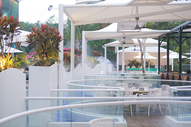 在热带雨林里吃海鲜大餐是什么感受? 我们是晚上来的,院子里的灯光与背景音乐所营造的氛围,很是浪漫~水池里的灯光和喷泉,跟着节奏的舞动变幻着,环绕周身的绿植加上人工云雾,仿佛在热带雨林里用餐一般,好不仙气满满~