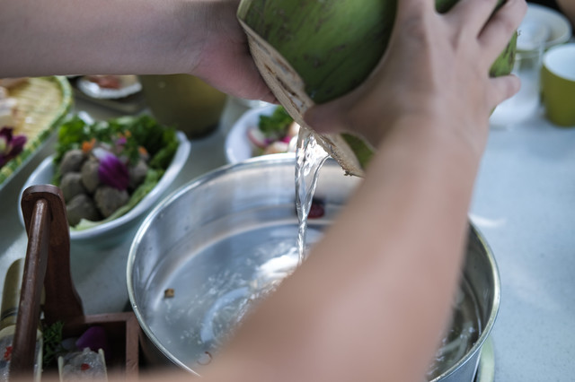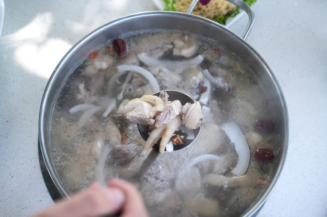 小院椰子鸡的打开方式: 原味椰子鸡汤是将三个青椰椰汁+一瓶矿泉水,倒入配有椰肉大枣马蹄的锅底中煮沸。然后滑入文昌鸡,(每桌都有一只小鸡计时器,不会错过最佳食用时间)香水扑鼻。答应我,一定一定要先喝汤,马蹄和椰肉都吸收了汤汁。再涮其它的肉、蔬菜等,看似吃的比较清淡,其实鲜掉眉毛啊。