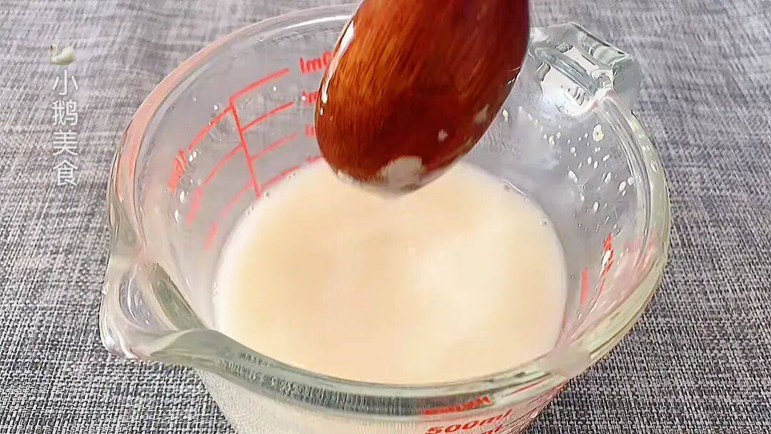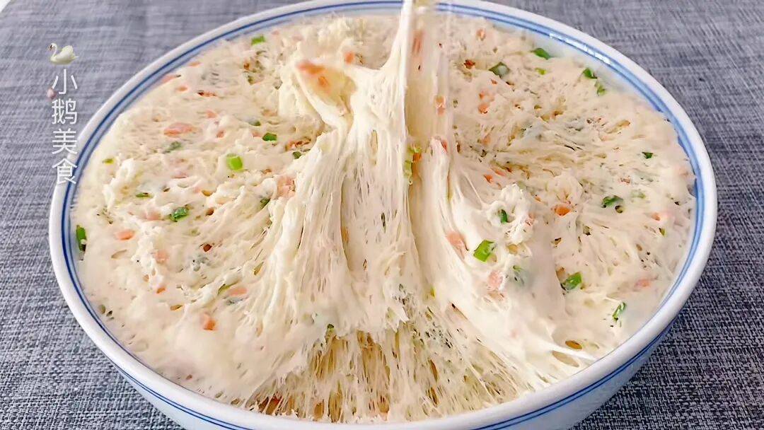 2. 调面糊:面粉加温水调成酸奶状,打入鸡蛋搅拌均匀。面糊要能挂在勺子上缓慢流下,太稀挂不住韭菜,太稠口感发硬。